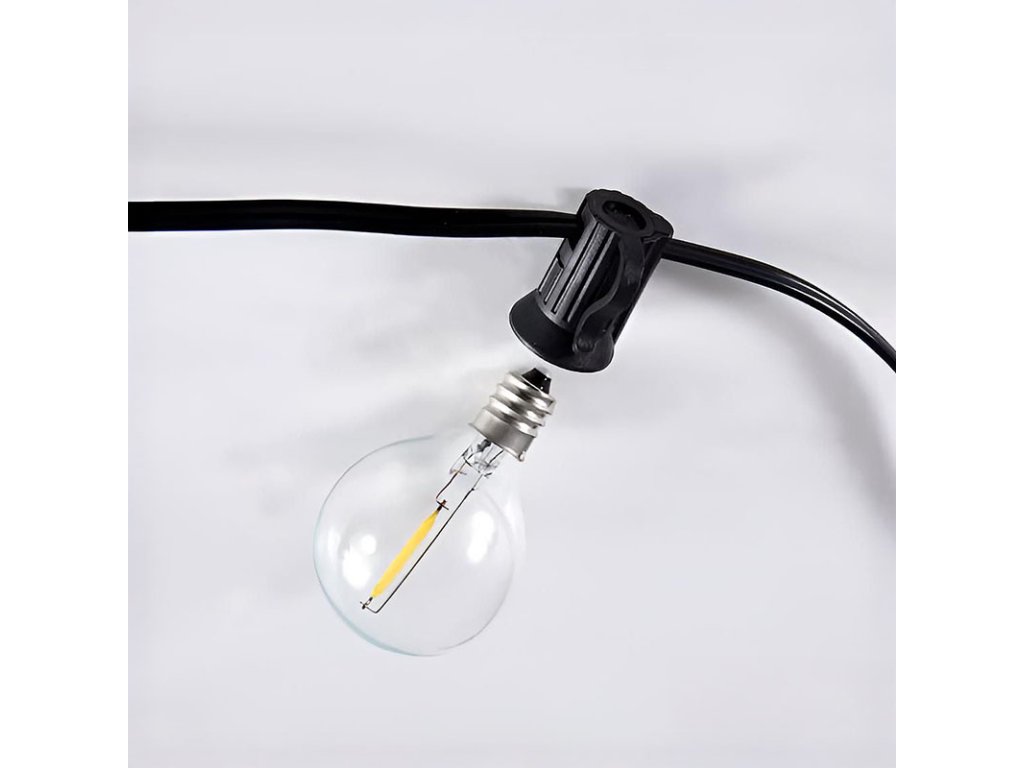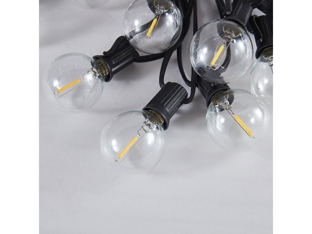 Štýlová vonkajšia reťaz LED s vymeniteľnými žiarovkami G40 prináša príjemnú atmosféru do každého exteriéru a interiéru. Reťaz obsahuje 25 žiaroviek LED s päticou E12, z ktorých každá poskytuje teplé biele svetlo (3000 K) so svietivosťou 30 lm. Celkový príkon je 9 W a svetelný tok dosahuje 750 lm, čo poskytuje jemné, ale dostatočné osvetlenie napríklad pre záhradné posedenie, pergolu alebo terasu.
