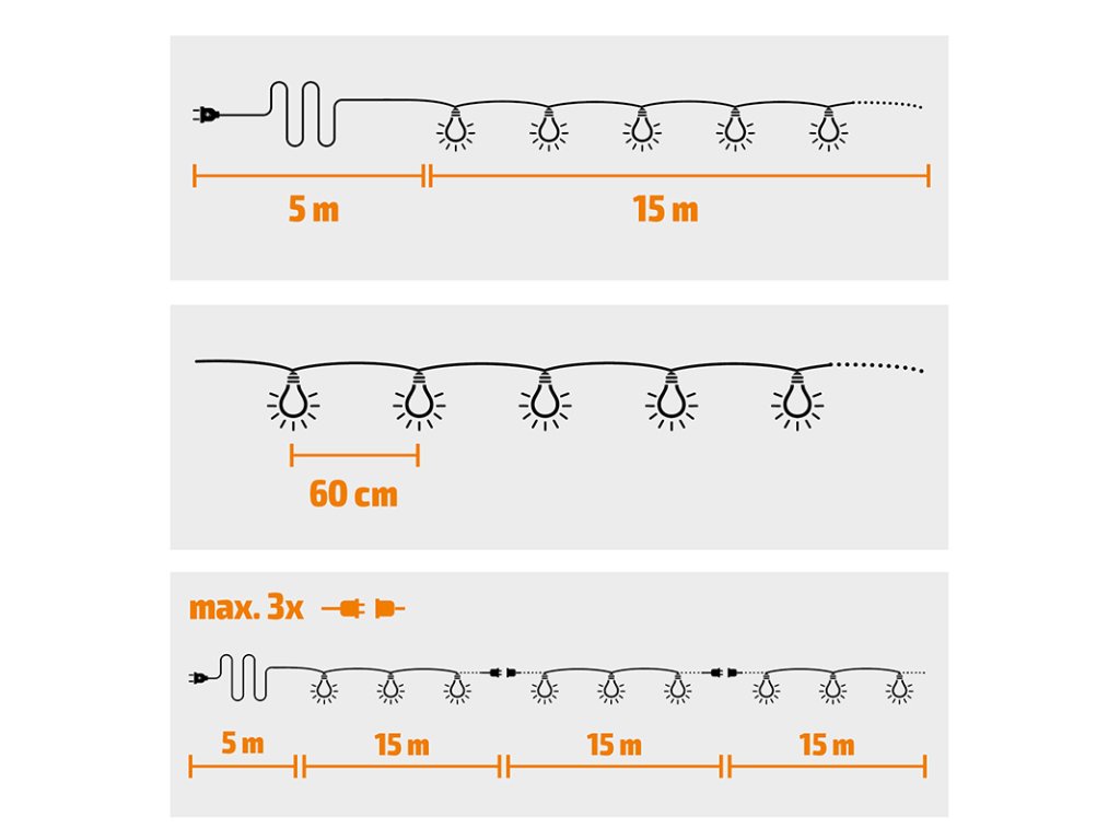 Dĺžka osvetlenej reťaze je 15 metrov, prívodný kábel meria 5 metrov a celková dĺžka je teda 20 metrov. Žiarovky sú rozmiestnené v 60 cm odstupoch a celú reťaz možno spojiť až s dvoma ďalšími kusmi (max. 3 kusy). Vďaka krytiu IP44 je reťaz vhodná na použitie v exteriéri aj interiéri a odoláva vlhkosti a miernemu dažďu. Žiarovky sú demontovateľné a súčasťou balenia sú aj 2 náhradné kusy. Ideálna voľba na večernú relaxáciu a slávnostnú výzdobu.