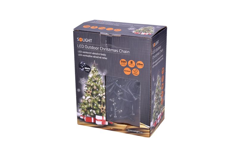 Solight LED vonkajšia vánočná reťaz, 200 LED, 20m, prívod 5m, 8 funkcií, časovač, IP44, studená biela