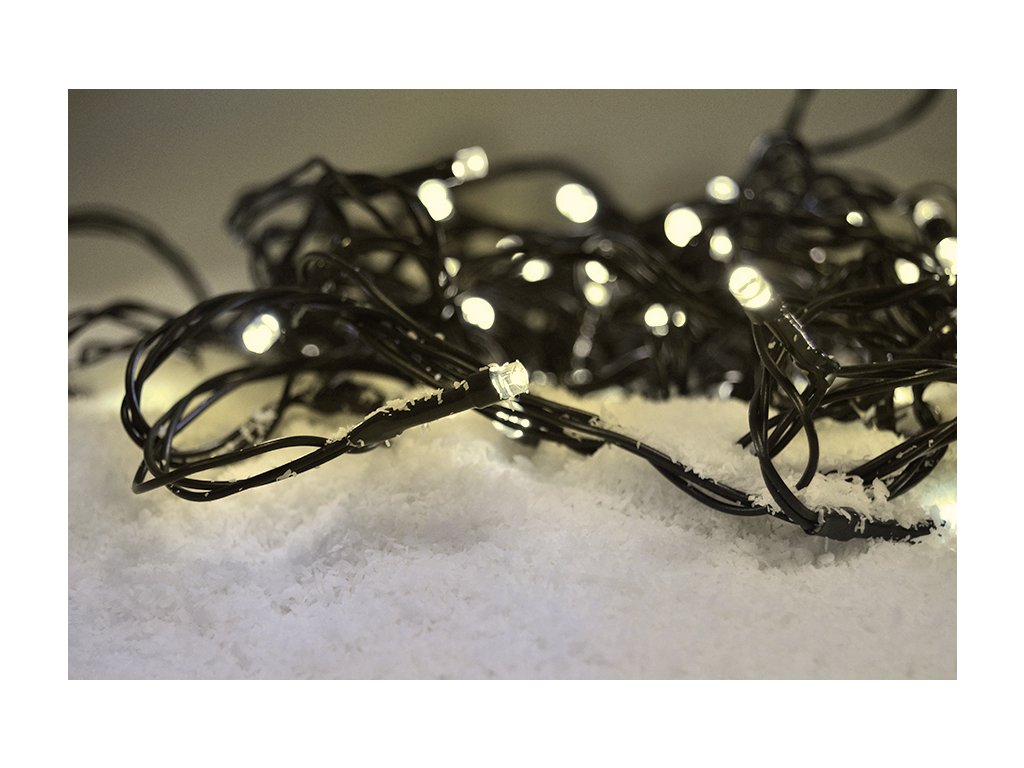 Reťaz je napájaná tromi batériami AA (nie sú súčasťou balenia), pričom ich životnosť je až 48 hodín v závislosti od kvality batérií. Zelená šnúra ladí s prírodným dekorom, takže je ideálnou voľbou pre tradičné aj moderné dekorácie. Svietiaca časť je dlhá 10 metrov a napájací kábel meria 3 metre. Vďaka stupňu krytia IP44 je reťaz vhodná na použitie v interiéri aj exteriéri. Balené vo farebnej krabici - skvelé aj ako darček.