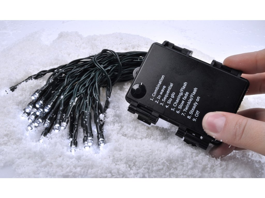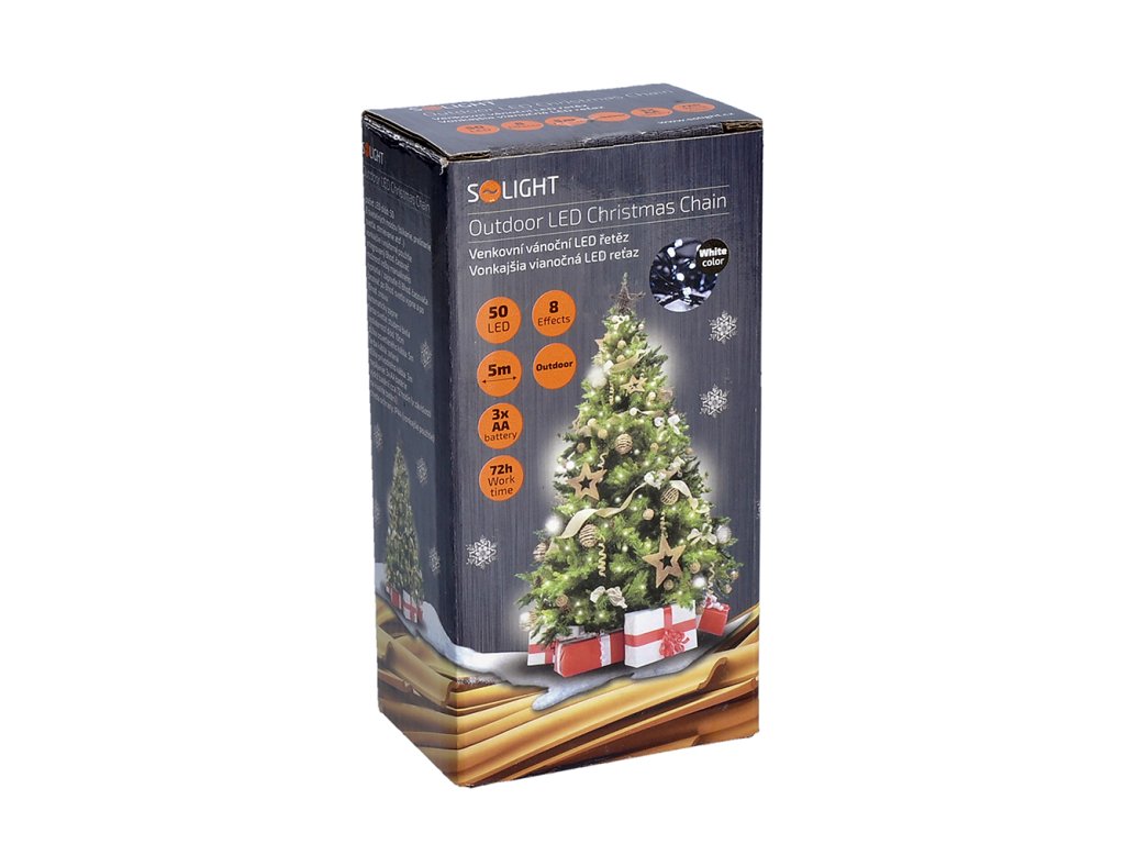 Solight LED vonkajšia vianočná reťaz, 50LED, 5m, 8 funkcií, IP44, 3x AA, studená biela