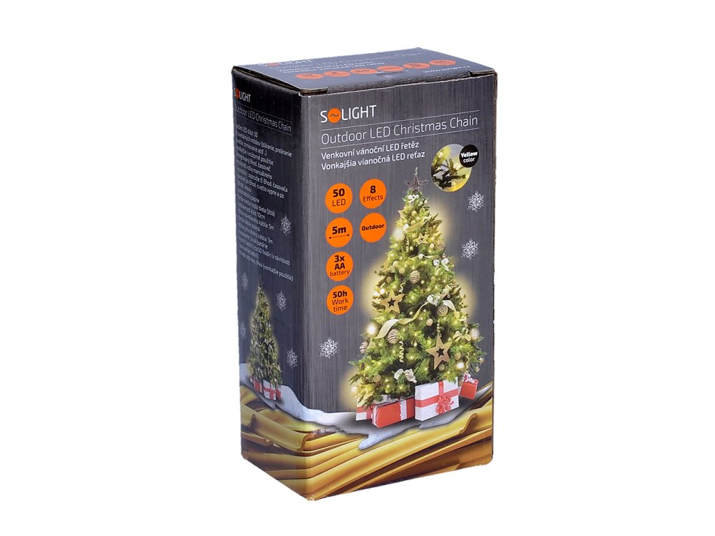 Solight LED vonkajšia vianočná reťaz, 50LED, 5m, 8 funkcií, IP44, 3x AA, teplá biela