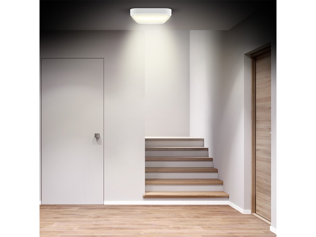 Svietidlo s krytím IP54 je odolné voči vlhkosti a prachu a materiály PP + PS zaručujú mechanickú a klimatickú odolnosť. Vďaka rozmerom 190 × 190 × 55 mm sa ľahko inštaluje aj v stiesnených priestoroch. Je vhodný do vstupných priestorov, na chodby, balkóny alebo do úžitkových miestností. Energetická trieda G a životnosť 30 000 hodín zaručujú nízke prevádzkové náklady a dlhú životnosť.