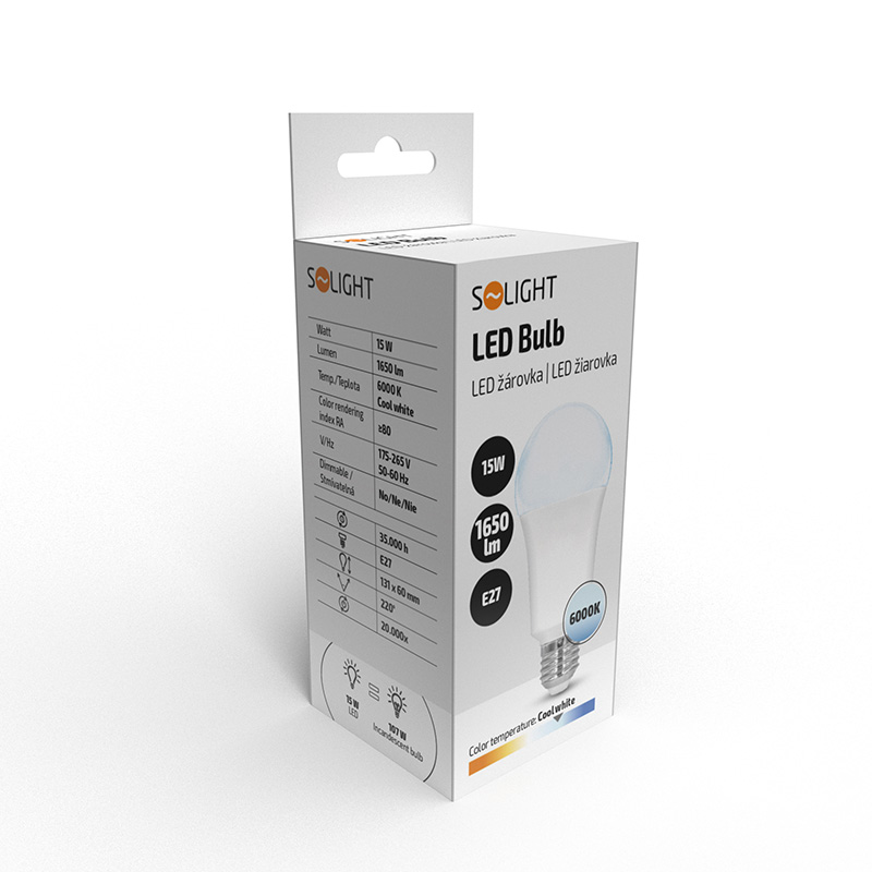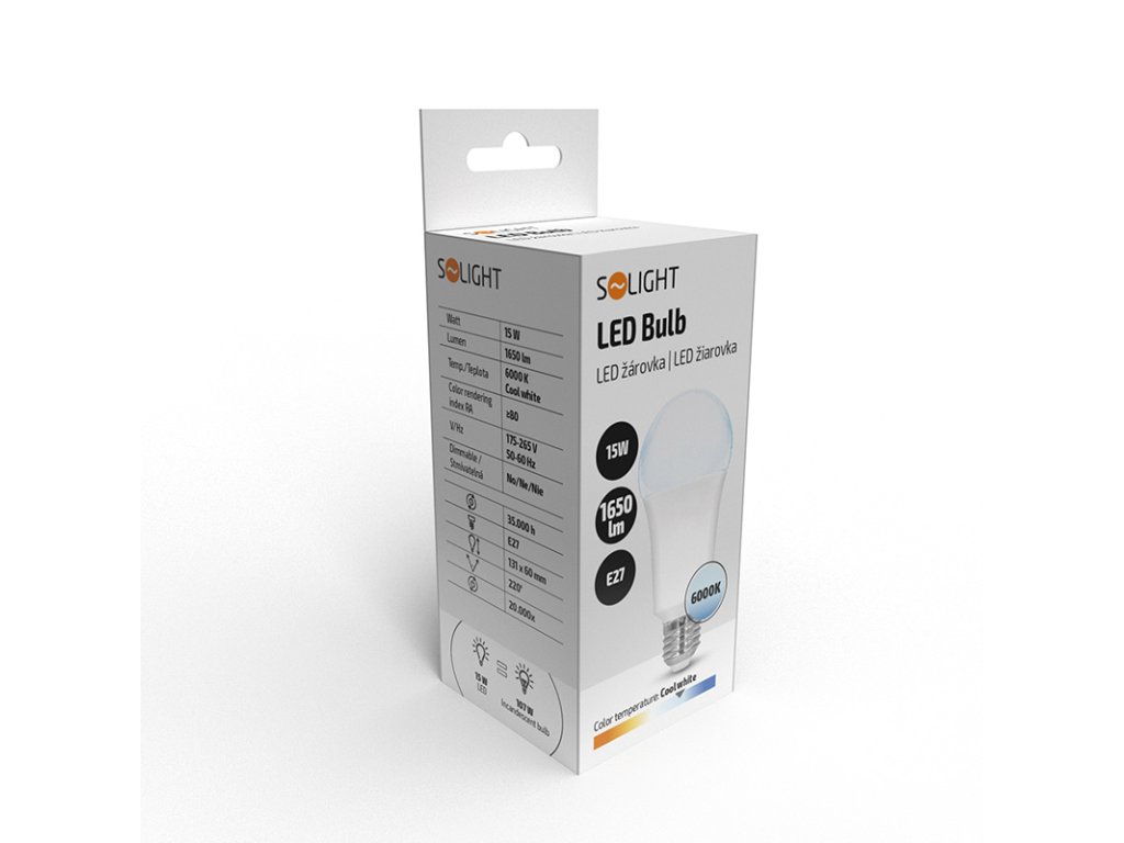 Solight LED žiarovka, klasický tvar, 15W, E27, 6000K, 220°, 1650lm