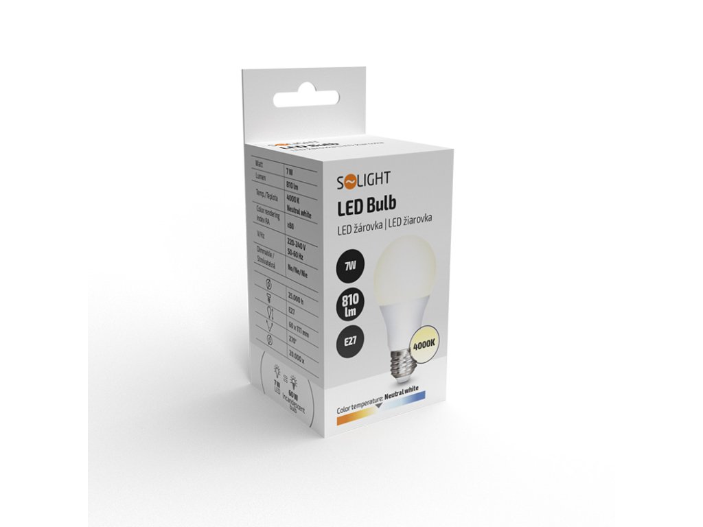 Solight LED žiarovka, klasický tvar, 7W, E27, 4000K, 270°, 810lm