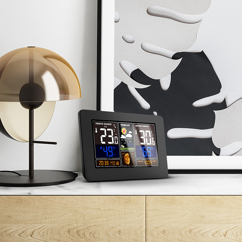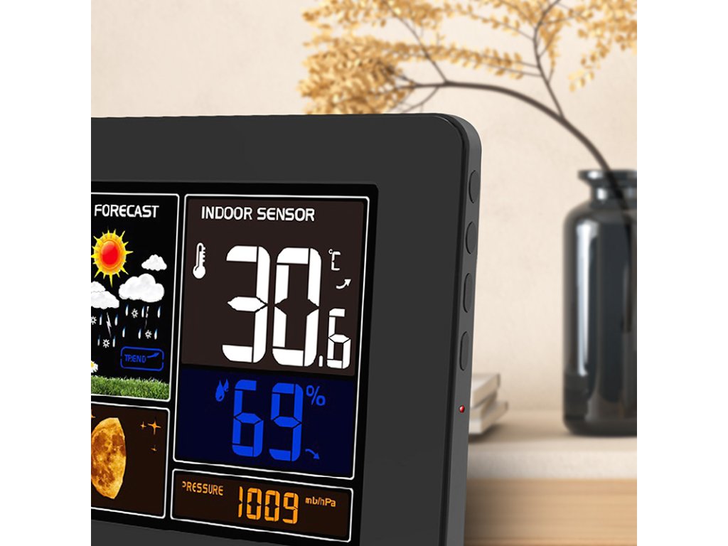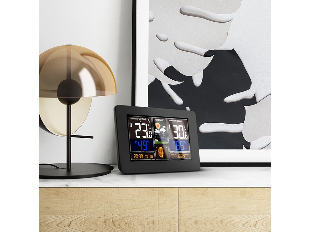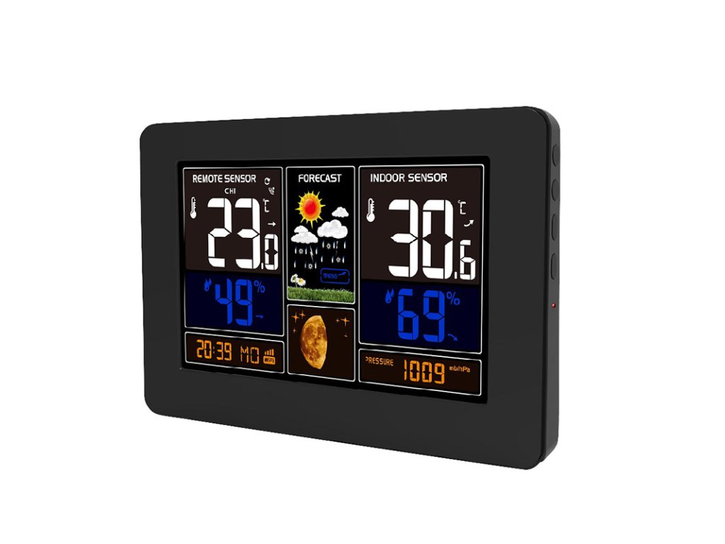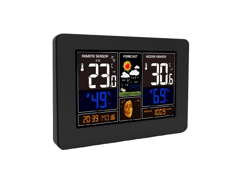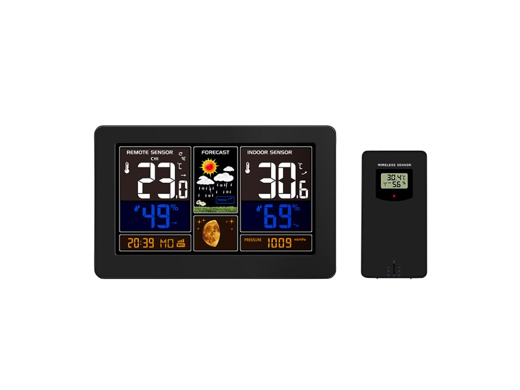 Túto meteorologickú stanicu možno ovládať prostredníctvom aplikácie Smart Life/TYUA pre mobilné zariadenia, ktorá umožňuje zobrazovať grafy vývoja teploty, tlaku a vlhkosti a kontrolovať aktuálne hodnoty. Meria vnútornú teplotu (-20 °C až +60 °C), vonkajšiu teplotu (-40 °C až +70 °C), vlhkosť (20 % až 95 %) a atmosférický tlak (600 hPa/mb až 1100 hPa/mb). Má pamäť minimálnych a maximálnych hodnôt, pripojenie až 3 bezdrôtových snímačov s dosahom 60 m, predpoveď počasia v 6 grafických úrovniach, ukazovateľ vývoja počasia, čas riadený systémom synchronizácie cez internet, kalendár, fázu mesiaca, názov dňa a ukazovateľ komfortu. Farebný podsvietený 19 cm (17,0 x 9,4 palca) displej s režimom úspory energie a 3 úrovňami podsvietenia. Rýchly prístup k ovládacím tlačidlám a možnosť montáže na stenu alebo použitia s podperným stojanom. Napájanie: AC 230V / DC 5V adaptér, 1200 mA (súčasťou dodávky) alebo 2 x AA batérie (nie sú súčasťou dodávky). Rozmery: 20,5 x 13 x 3 cm, farba: čierna.