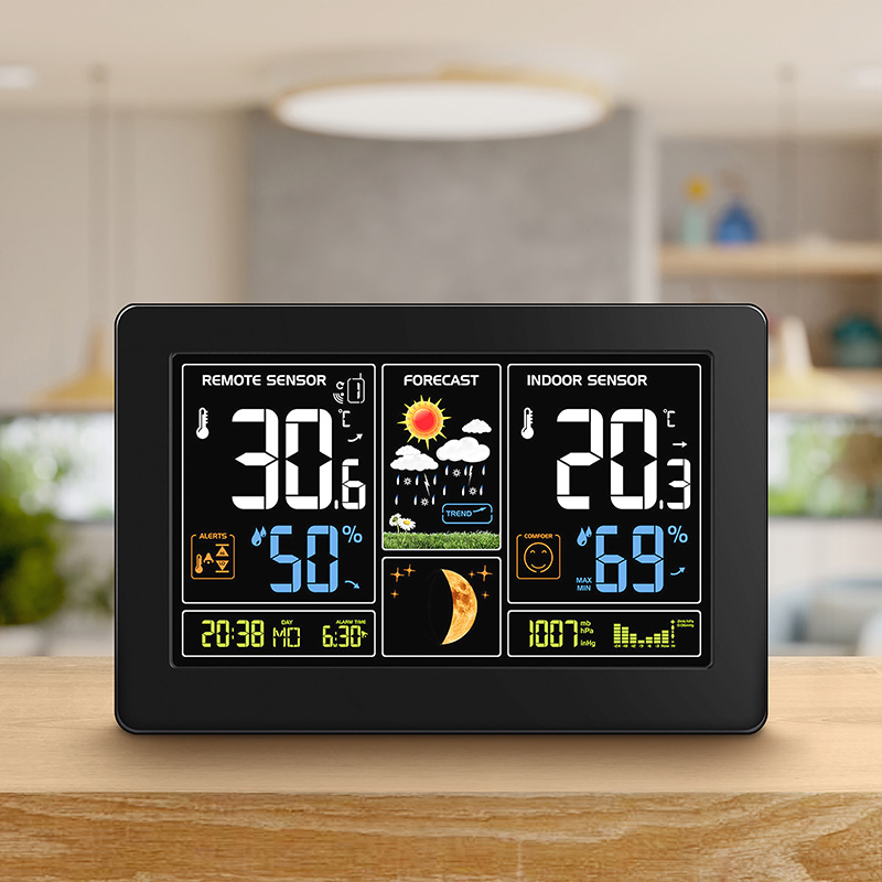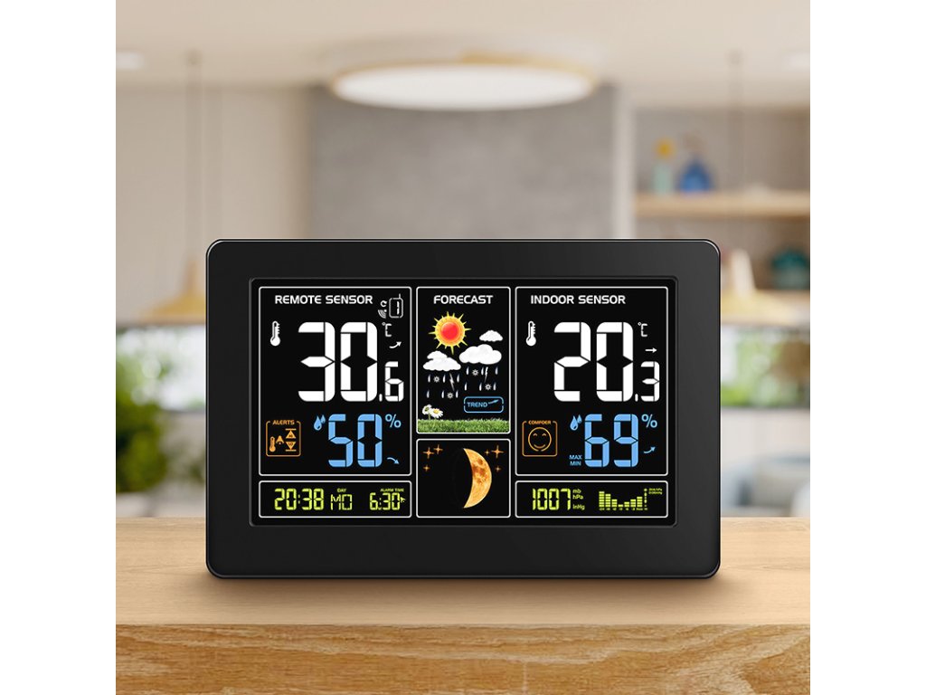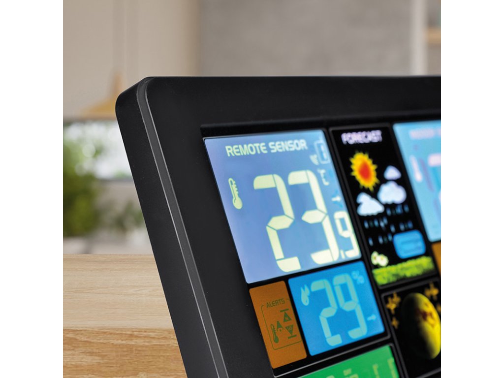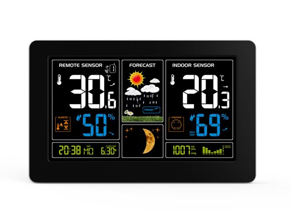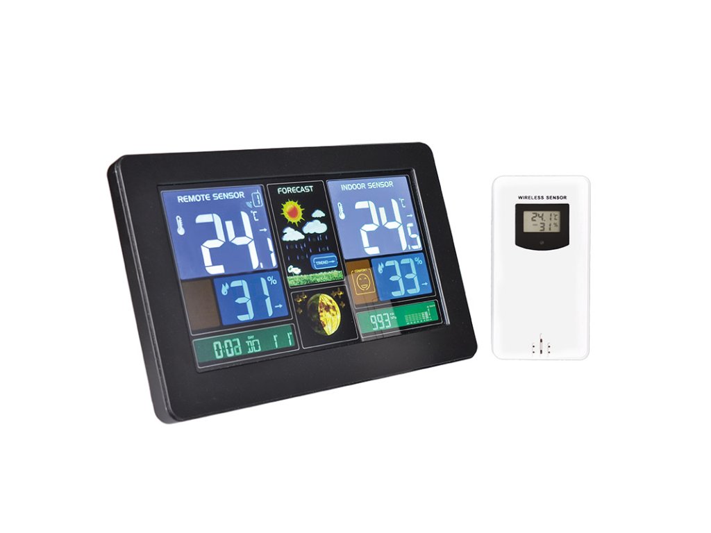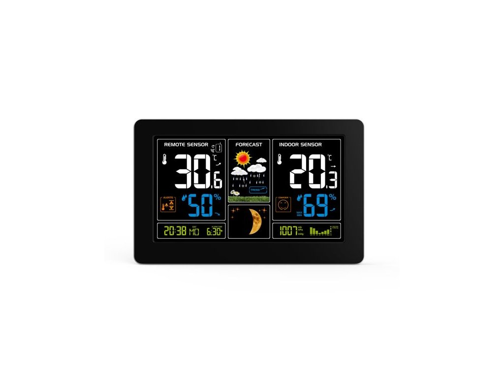 Táto meteostanica je ideálna na monitorovanie počasia v interiéri aj exteriéri. Meria teplotu v interiéri od 0 °C do +50 °C, vonkajšiu teplotu od -20 °C do +60 °C a vlhkosť vzduchu v interiéri (20 % - 95 %) aj v exteriéri. Meria aj atmosférický tlak (600 hPa/mb - 1100 hPa/mb) a poskytuje presnú predpoveď počasia v 6 grafických úrovniach. Umožňuje pripojenie až 3 bezdrôtových snímačov s dosahom až 60 m v otvorenom priestore a funkciu cyklického prepínania medzi snímačmi. Meteostanica ponúka režim úspory energie displeja s 5 úrovňami podsvietenia pre optimálnu čitateľnosť. Je vybavená rádiom riadeným časom, kalendárom, fázami mesiaca a budíkom s funkciou odloženia. Pamäť minimálnych a maximálnych hodnôt teploty a vlhkosti sa automaticky ukladá pre obe oblasti merania, čo umožňuje jednoduché sledovanie historických údajov. 7,5" (17,0 x 9,4 cm) farebný podsvietený displej poskytuje rýchly a pohodlný prístup k ovládacím tlačidlám na bočnej hrane. Meteostanicu možno zavesiť na stenu alebo umiestniť na stojan. Napájanie zabezpečuje adaptér AC 230 V alebo DC 5 V (je súčasťou dodávky) a na prevádzku hlavnej jednotky a snímača sú potrebné batérie 2 x AA. táto stanica je praktickým a štýlovým doplnkom každej domácnosti alebo kancelárie a poskytuje presné a aktuálne informácie o počasí pre vaše pohodlie a komfort.