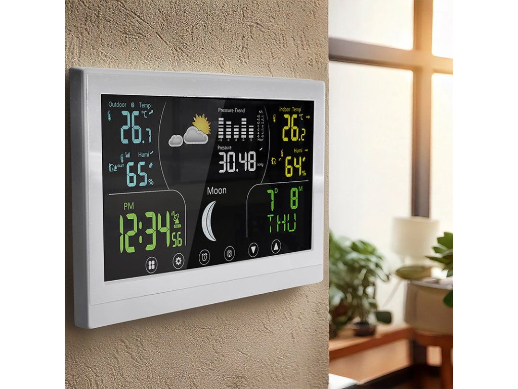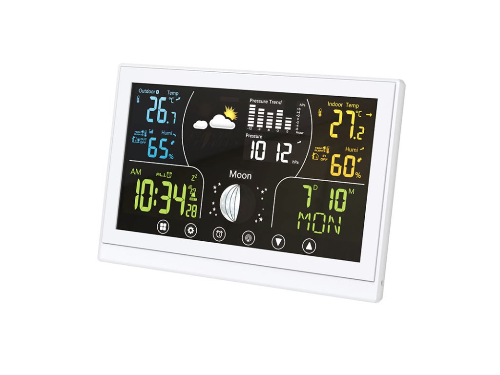 Táto meteostanica je vybavená farebným dotykovým displejom VA s rozmermi 168 x 93 mm, ktorý zaručuje vynikajúcu čitateľnosť a intuitívne ovládanie. Vďaka možnosti trvalého podsvietenia je displej prehľadný aj v tme. Displej poskytuje širokú škálu informácií vrátane aktuálnej teploty (vnútorná od -10 °C do +50 °C, vonkajšia od -50 °C do +70 °C), relatívnej vlhkosti (1 % až 99 % RH), atmosférického tlaku a predpovede počasia. Okrem toho zobrazuje fázy mesiaca, kalendár, dátum a hodiny riadené signálom DCF, čím zabezpečuje vždy presný čas. Stanica umožňuje zaznamenávanie minimálnych a maximálnych hodnôt, nastavenie teplotných výstrah, výber jednotiek teploty (°C/°F) a dokonca aj korekciu nadmorskej výšky na presnejšie meranie tlaku. Je vybavená funkciou budíka s možnosťou opakovaného budenia, čo z nej robí praktického pomocníka nielen na monitorovanie počasia, ale aj na každodenné použitie. Bezdrôtový snímač s dosahom až 100 m (je súčasťou dodávky) umožňuje presné meranie vonkajších podmienok a súčasne možno pripojiť až tri snímače. Hlavnú jednotku možno napájať buď adaptérom (5 V DC/300 mA), alebo tromi batériami AAA, zatiaľ čo snímač používa dve batérie AAA. Vďaka kompaktným rozmerom hlavnej jednotky (17 × 192 × 127 mm) a elegantnému čiernemu dizajnu je vhodná do každého interiéru a predstavuje moderný a štýlový doplnok domácnosti.