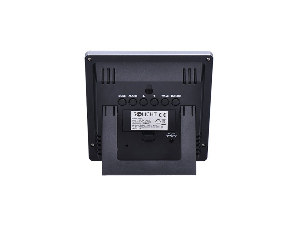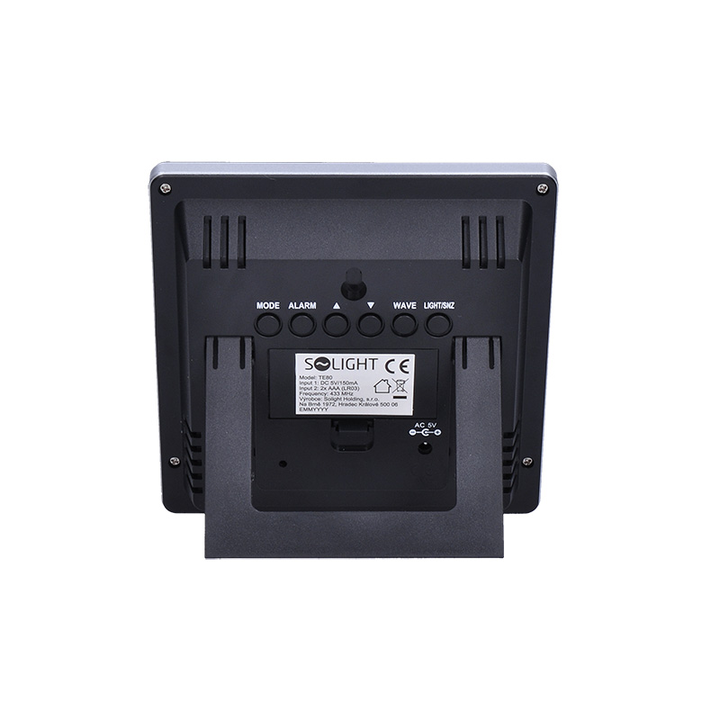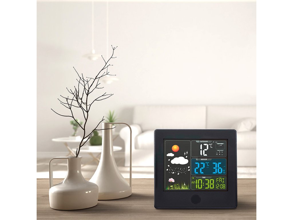 Malá meteorologická stanica s meraním vnútornej teploty (0 °C až +50 °C) a vonkajšej teploty (-20 °C až +60 °C), vlhkosti (25 % - 95 %). Predpoveď počasia v 4 grafických úrovniach, bezdrôtový senzor (dosah 60 m). Pamäť minimálnej/maximálnej teploty a rádiom riadený čas. Podsvietený farebný displej (4,8"), budík s odloženým budíkom. Napájanie: 230V AC adaptér alebo 2x AAA batérie. Možnosť montáže na stenu.