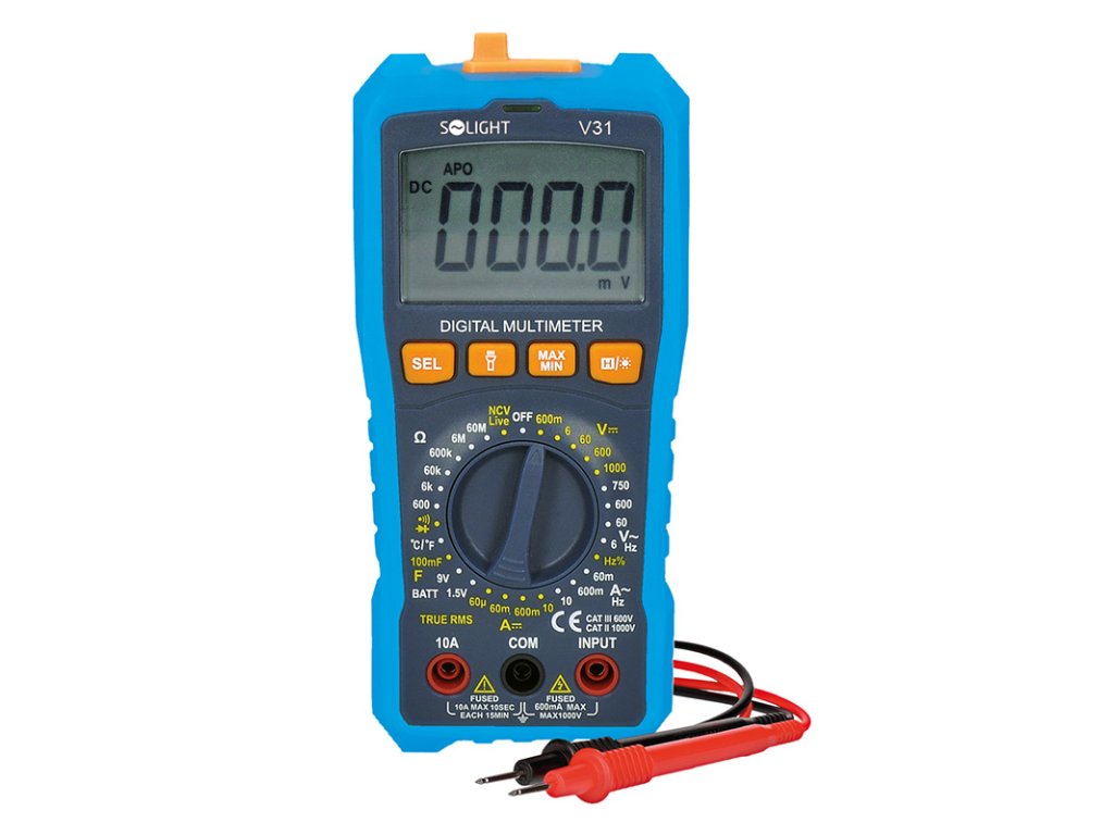 Multimetre na meranie striedavého a jednosmerného napätia, prúdu, odporu, frekvencie, kapacity a teploty. Ponúka meranie skutočnej efektívnej hodnoty, test tranzistorov a diód, test spojitosti obvodov, NCV (bezkontaktný detektor napätia) a LIVE (tester vodičov pod napätím). Funkcia HOLD na uloženie hodnoty, MIN/MAX nameranej hodnoty, LED svietidlo a indikácia slabej batérie. Ochrana proti preťaženiu pomocou poistiek 10A/600V a 500mA/600V. Napájanie: 2x AAA batérie. Rozmery: 186x87x50 mm, hmotnosť: 310 g.