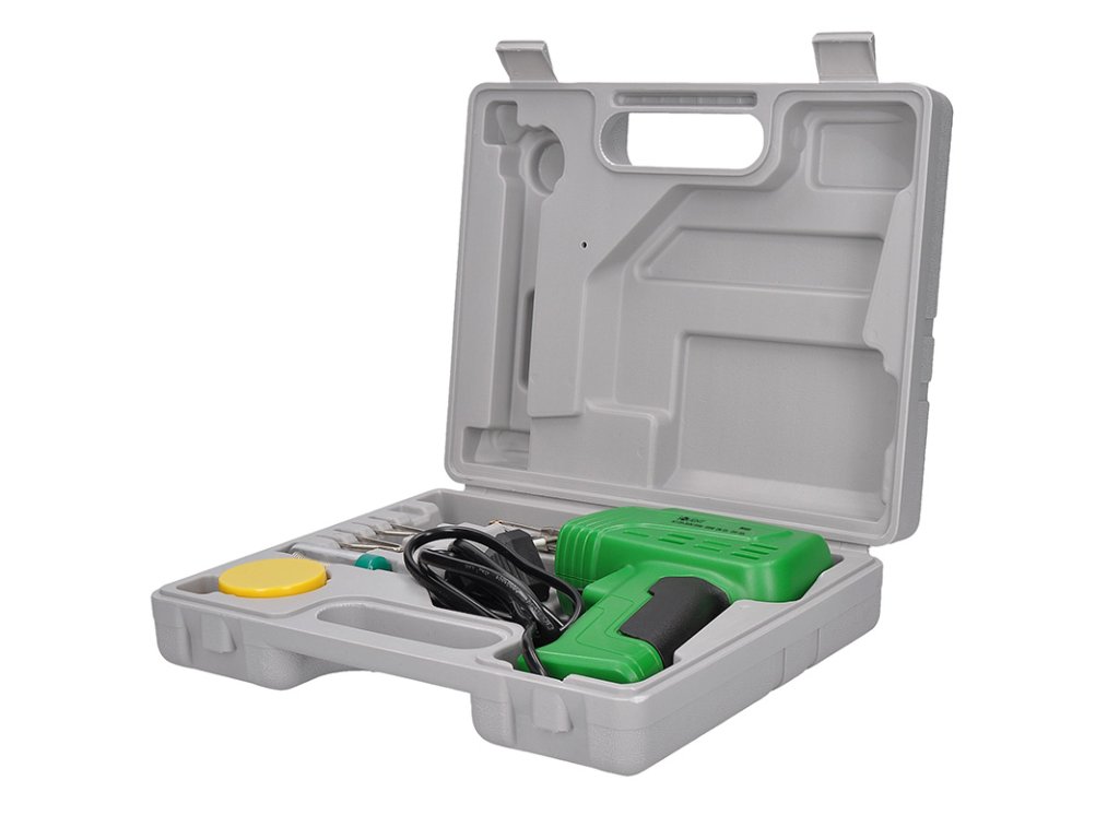 Sada spájkovacích pištolí 100 W v praktickom kufríku, ideálna na domáce a profesionálne použitie. Obsahuje spájkovačku s pájkovacím očkom 1,8 mm, náhradné slučky, kolofóniu a cín (Sn 99,3 %, Cu 0,7 %). Napájanie 230 V / 50 Hz, dĺžka prívodu 120 cm. Ideálna súprava na presné a spoľahlivé spájkovanie.