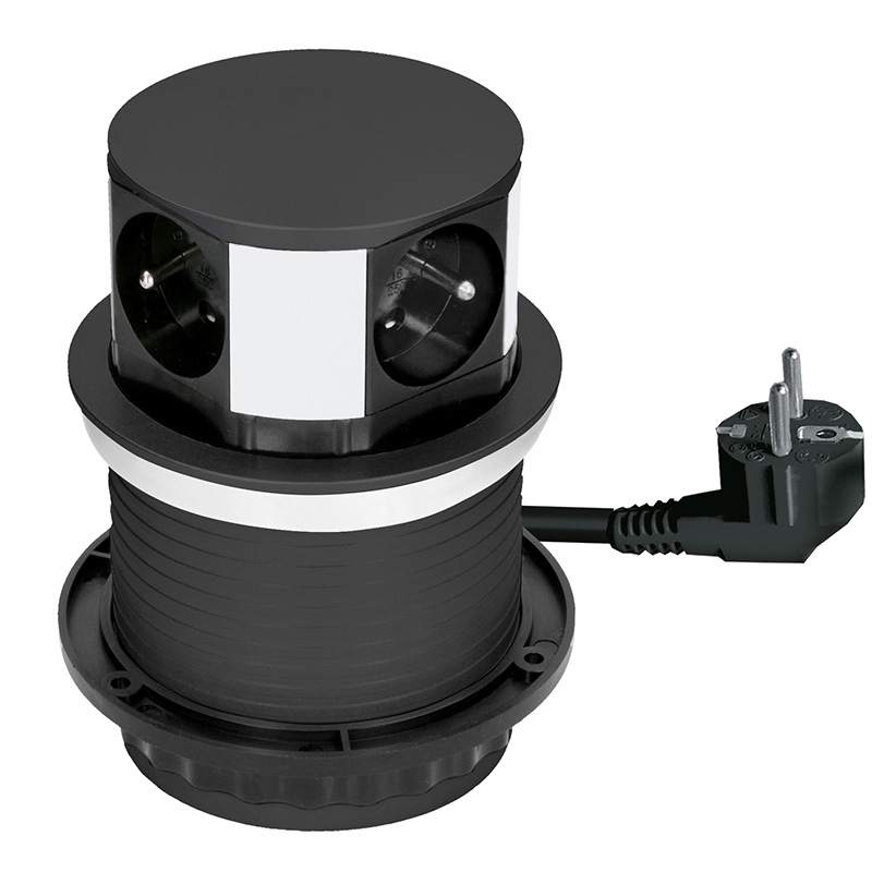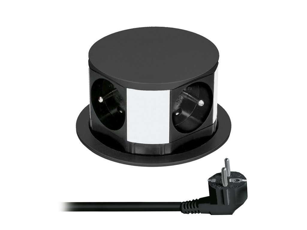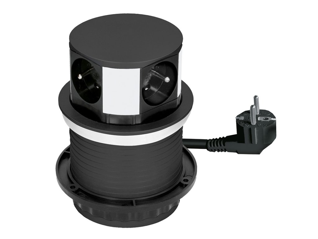Výsuvný blok zásuviek so štyrmi 230V zásuvkami prináša praktické a designovo čisté riešenie napájania priamo do pracovnej plochy. Kruhové telo umožňuje pohodlný prístup zo všetkých strán, ideálny pre pracovné stoly, kuchynské linky alebo konferenčné miestnosti. Výsuvný mechanizmus chráni zásuvky pred nečistotami a neruší celkový vzhľad interiéru.