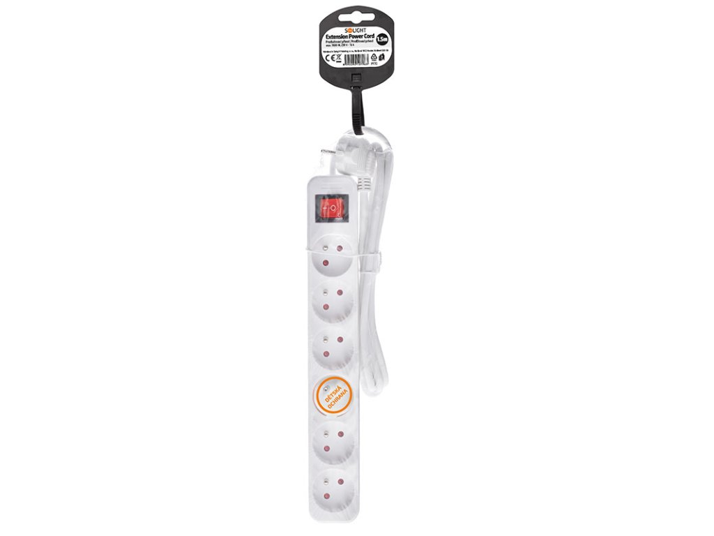 Solight predlžovací prívod, 6 zásuviek, biely, vypínač, 1,5m