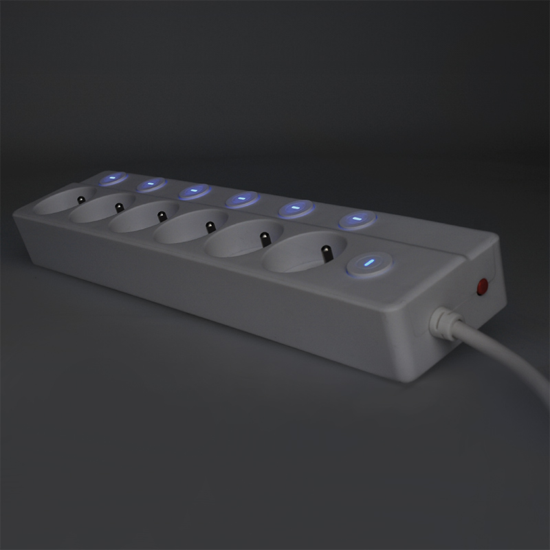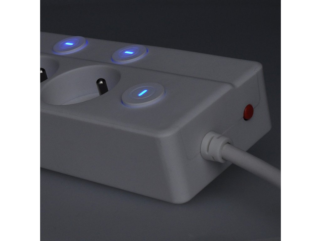 Prívod so šiestimi zásuvkami a celkom siedmimi vypínačmi ponúka maximálnu kontrolu nad pripojenými zariadeniami. Vďaka samostatným vypínačom šetríte nielen elektrinu, ale aj životnosť spotrebičov. Siedmy hlavný vypínač umožňuje odpojiť všetkých päť zásuviek naraz. Decentné modré podsvietenie signalizuje, ktorá zásuvka je práve aktívna.