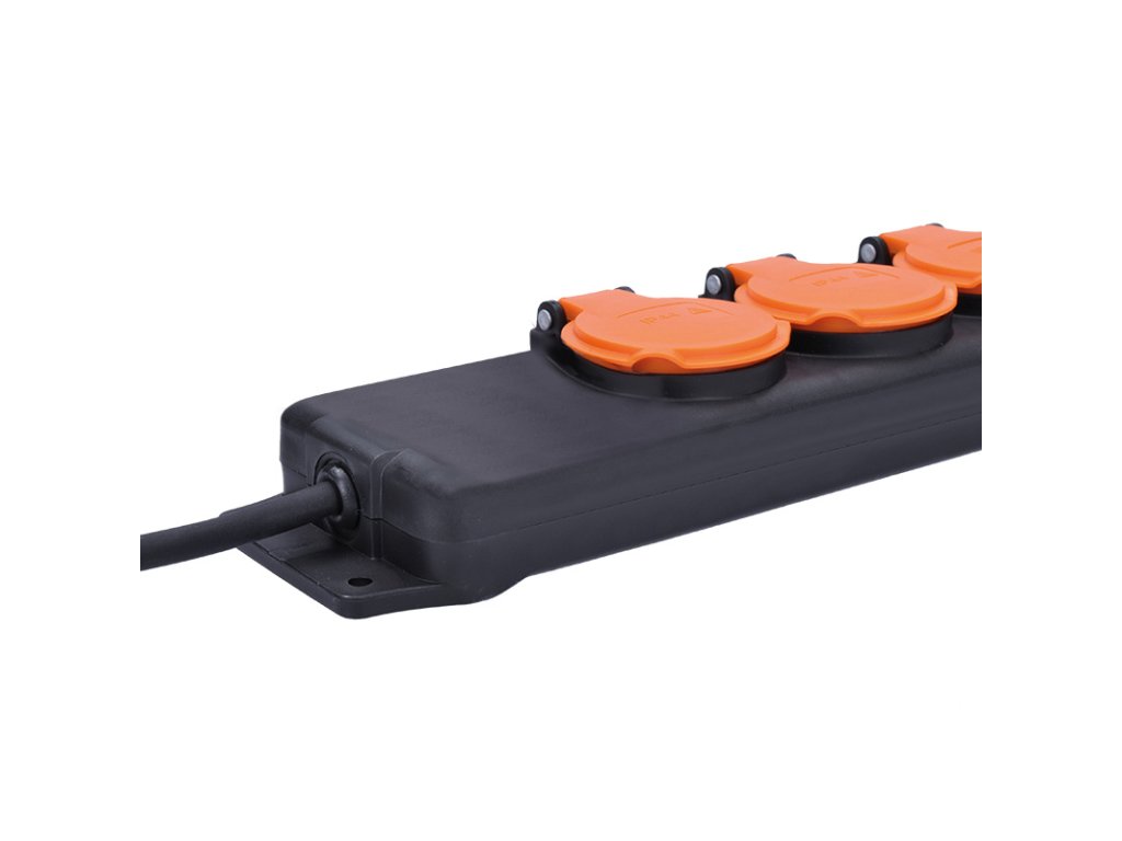 Odolný gumový kábel je určený na stredné mechanické zaťaženie a použitie v exteriéri. Zásuvky sú opatrené samozatváracími ochrannými viečkami proti vlhkosti a prachu.