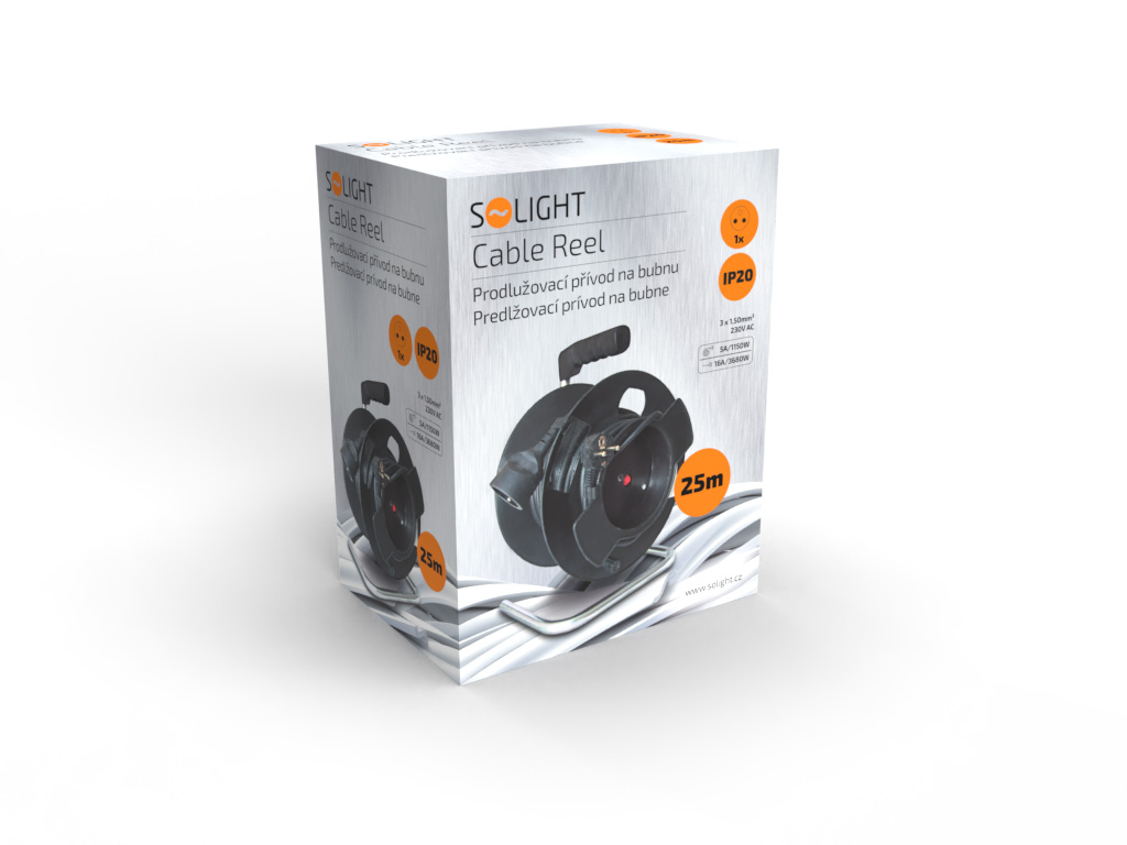 Solight predlžovací prívod na bubne, 1 zásuvka, 25m, čierny kábel, 3x 1,5mm2
