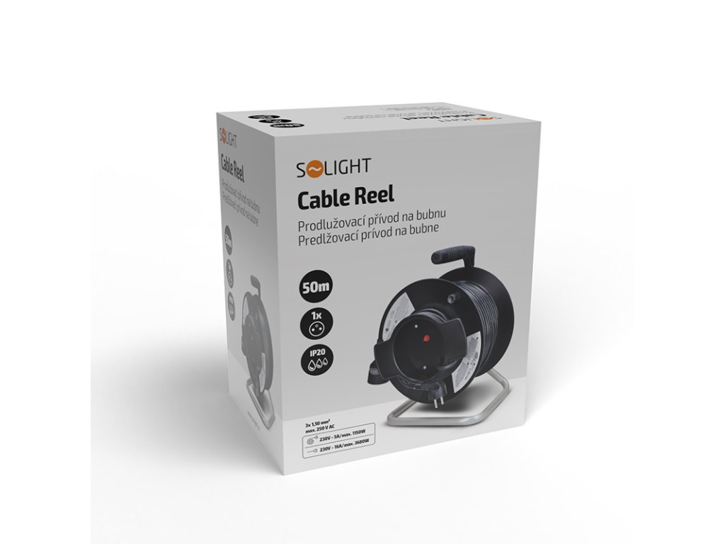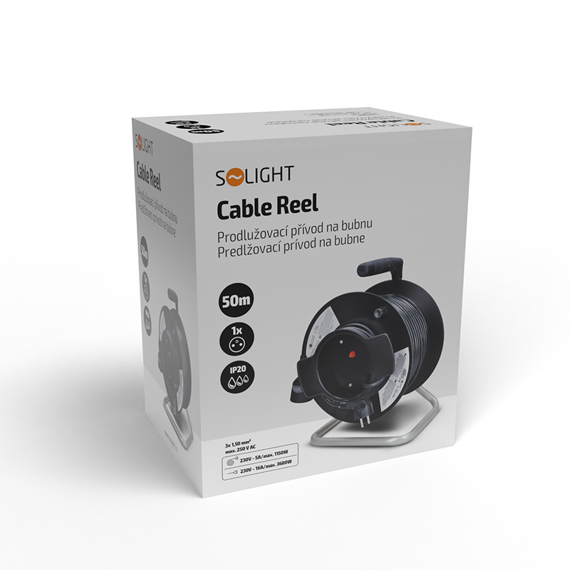 Solight predlžovací prívod na bubne, 1 zásuvka, 50m, čierny kábel, 3x 1,5mm2