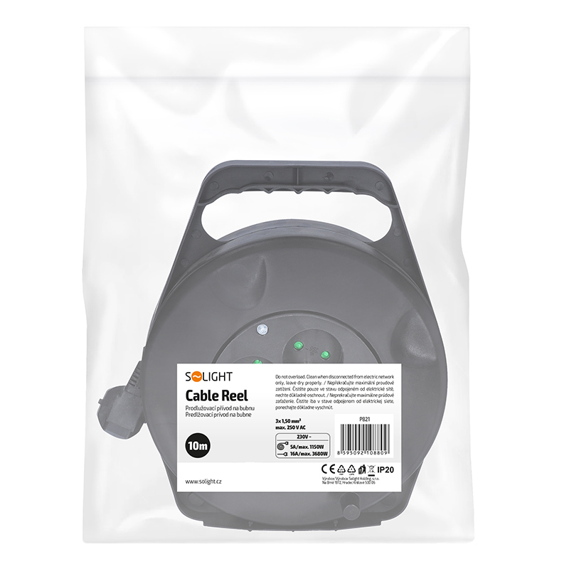 Solight predlžovací prívod na bubne, 4 zásuvky, 10m, čierny kábel, 3x 1,5mm2