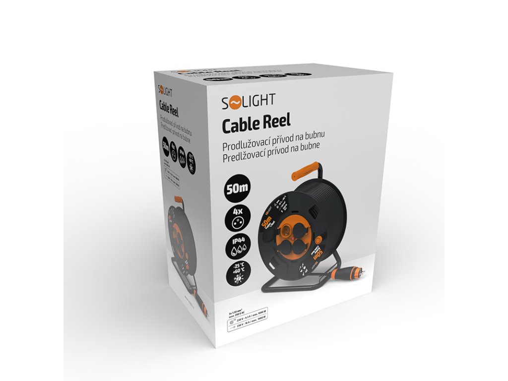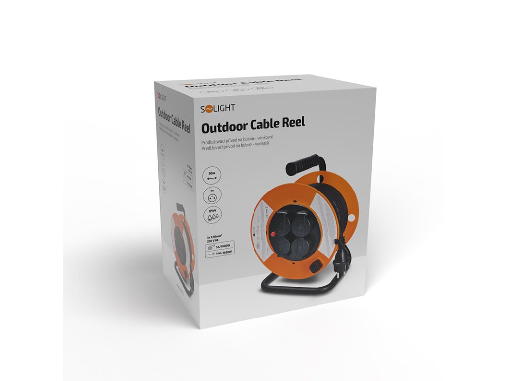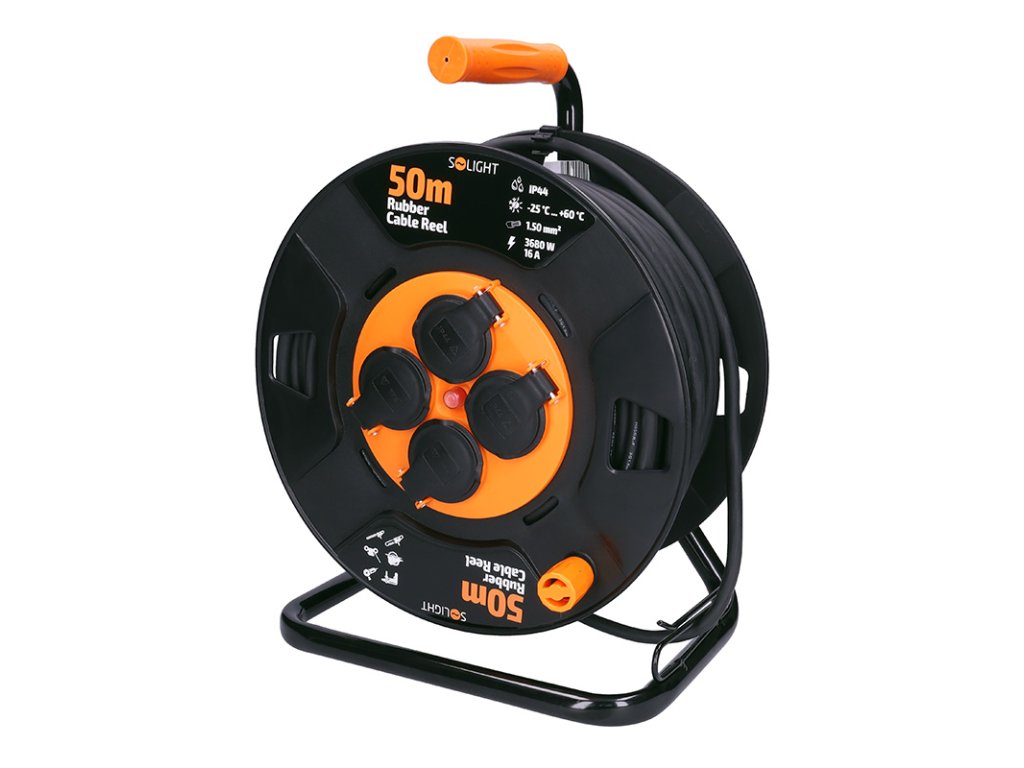 Solight predlžovací prívod na bubne, 4 zásuvky, vonkajší, 50m gumový kábel, 3x 1,5mm2, IP44