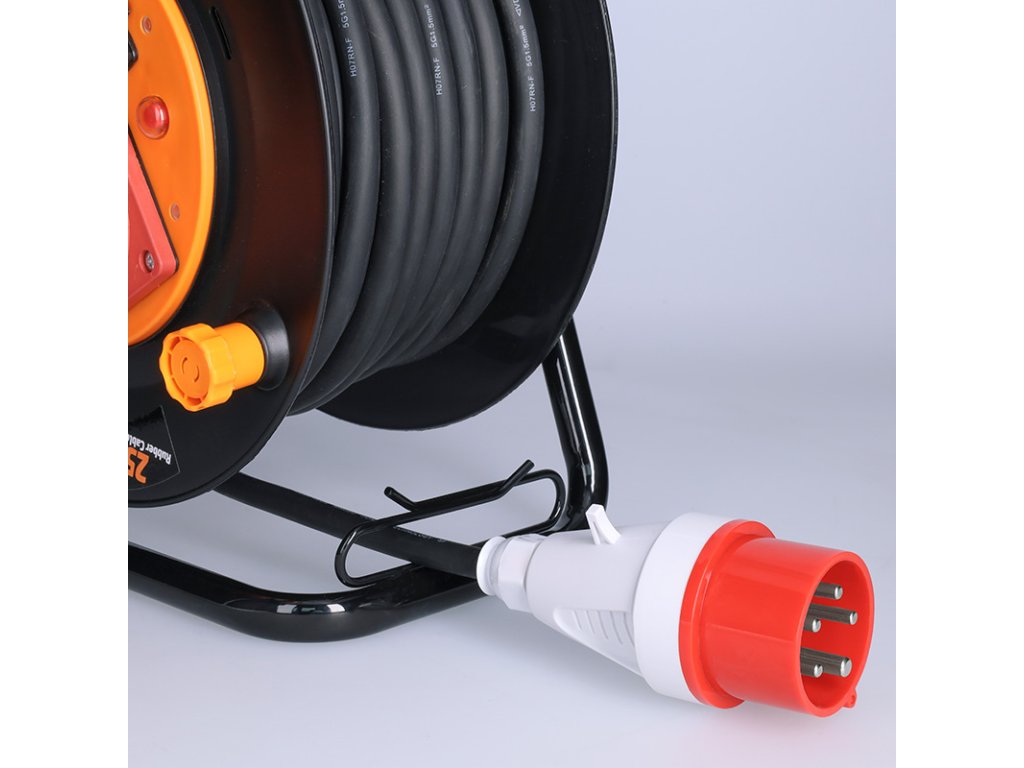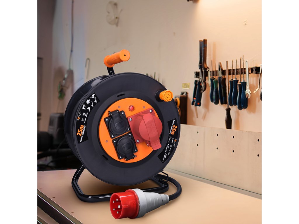 Robustný predlžovací prívod na bubne s dĺžkou 25 metrov, jednou zásuvkou na 400 V a dvoma zásuvkami na 230 V je ideálnou voľbou pre napájanie stavebných strojov, profesionálneho náradia alebo dielenského vybavenia. Vďaka káblu z mäkčenej gumy a krytiu IP44 je vhodný aj do náročných podmienok na stavbách alebo v priemysle. Samovoľnému navíjaniu bráni integrovaná aretačná brzda.