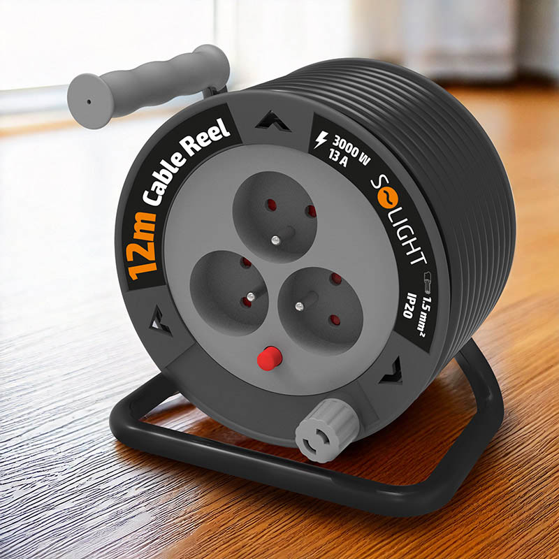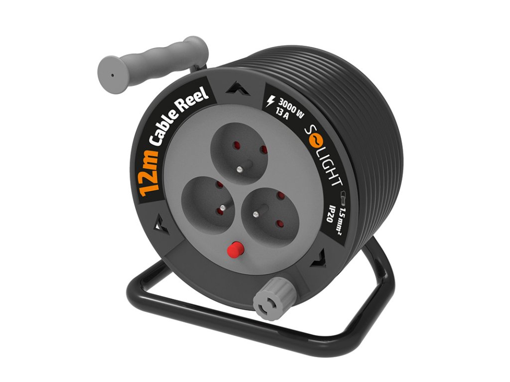 Solight predlžovací prívod na bubne 12m, 3 zásuvky, čierny kábel, 3x 1,5mm2