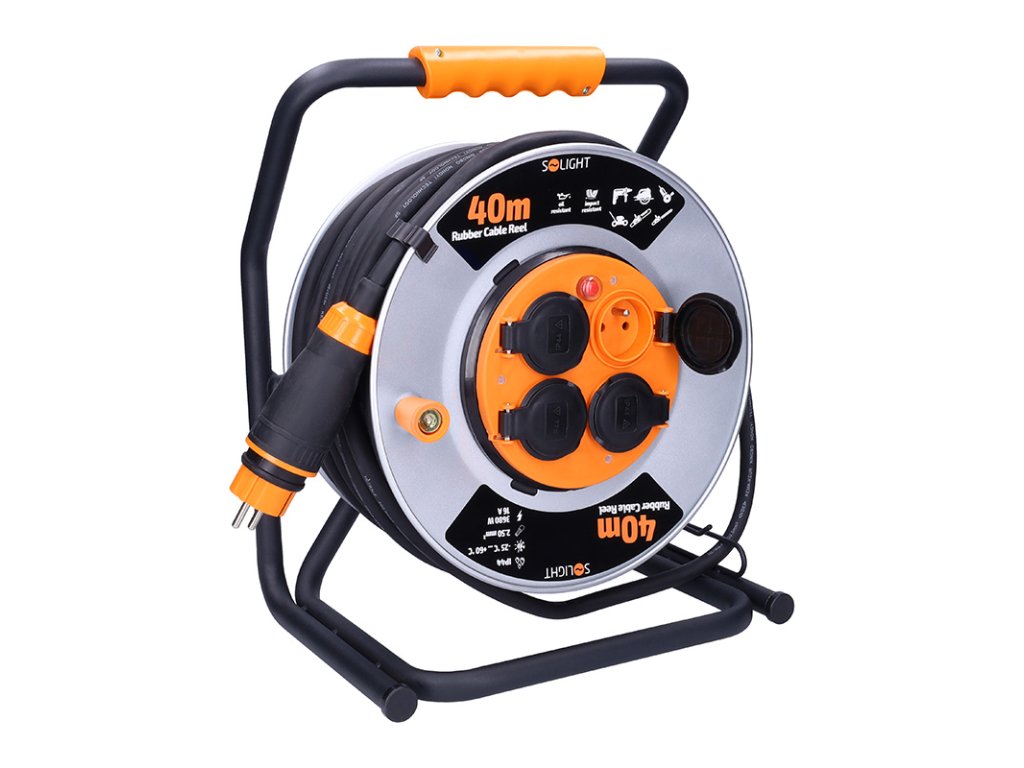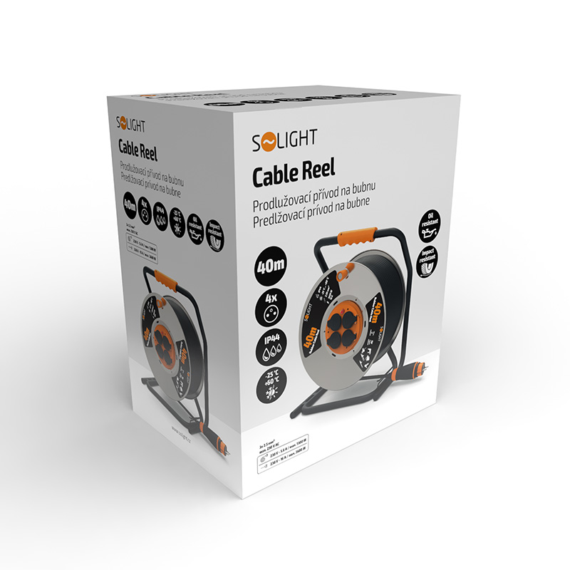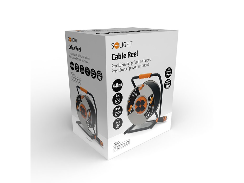 Solight predlžovací prívod - na kovovom bubne, 4 zásuvky, 40m kábel guma-neoprén, 3x 2,5mm2, IP44