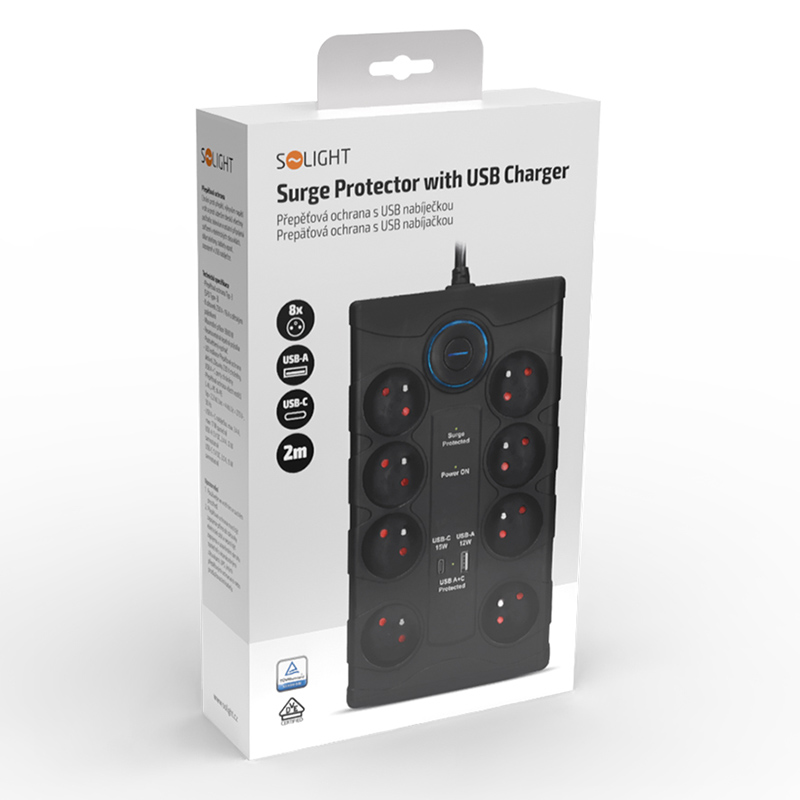 Solight prepäťová ochrana, 8z, USB A+C, 2m, čierna