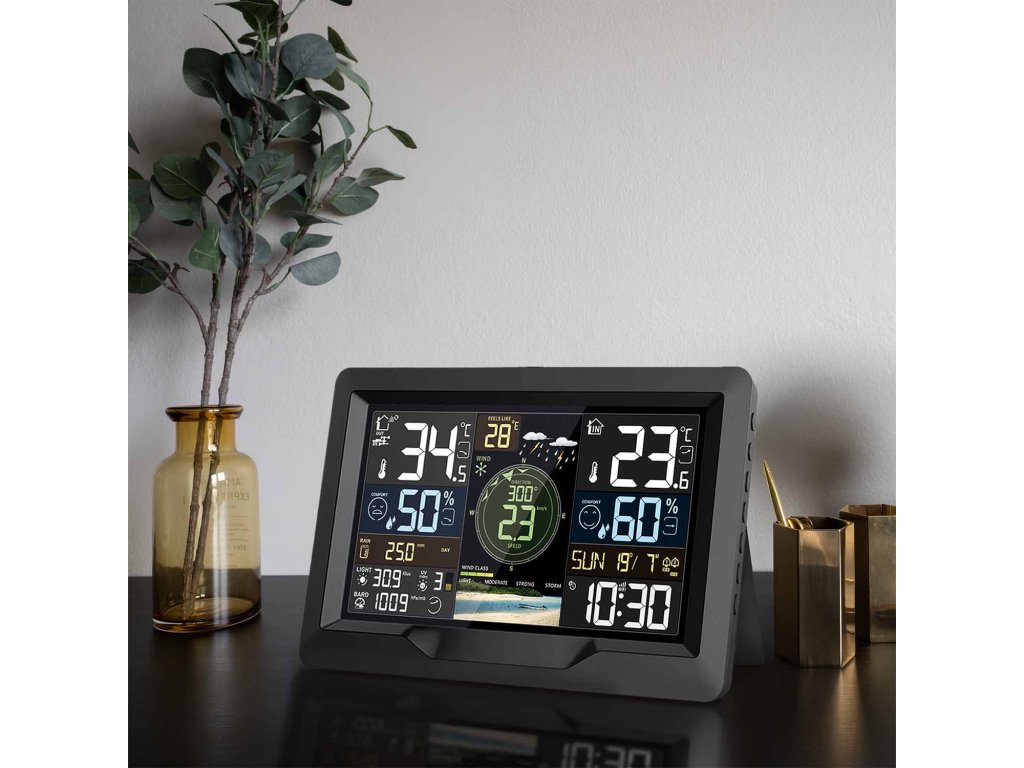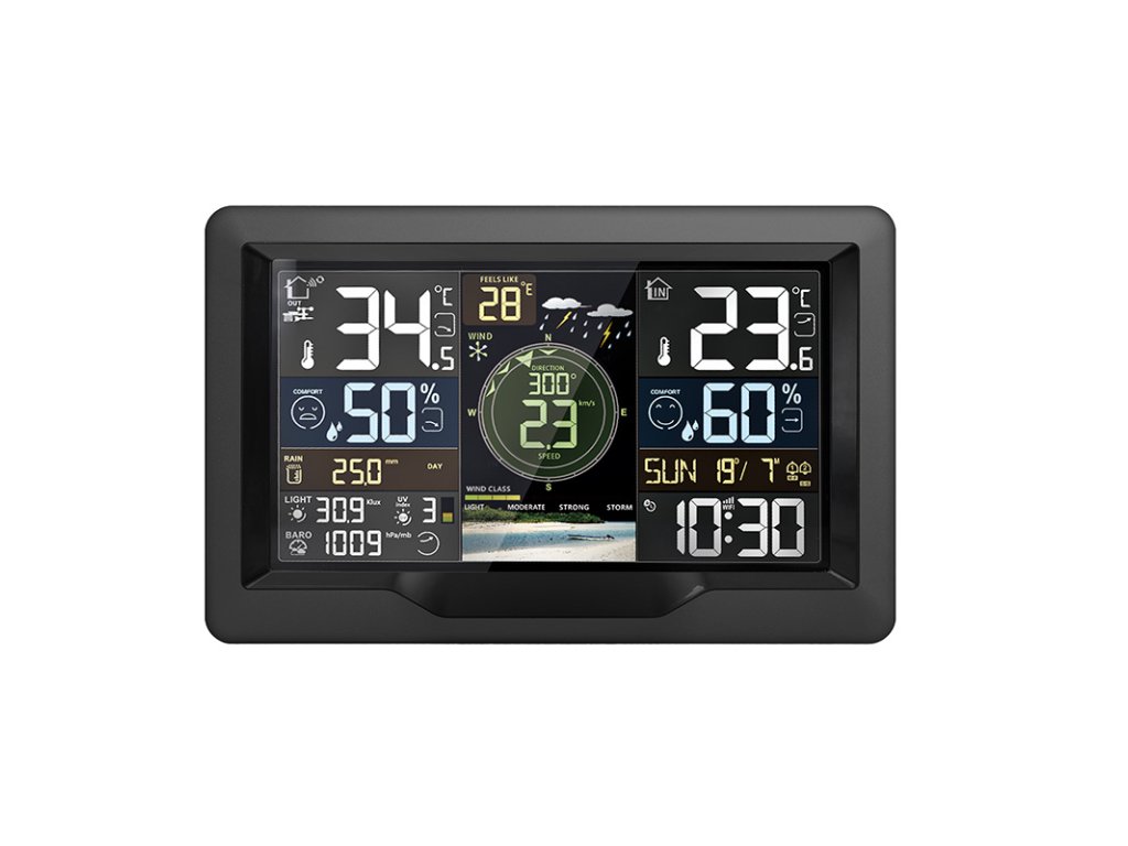 Táto profesionálna meteorologická stanica je špičkový nástroj na podrobné monitorovanie poveternostných podmienok s možnosťou pripojenia k aplikácii Smart Life / Tuya Smart, ktorá umožňuje zobrazovať aktuálne údaje a prevádzať ich do prehľadných grafov. Ponúka automatické nastavenie času prostredníctvom internetu, kalendár do roku 2099 a dva budíky s funkciou odloženia. Vďaka vysoko presným snímačom meria vnútornú (-20 °C až 50 °C) a vonkajšiu teplotu (-40 °C až 70 °C), vlhkosť (20 % až 95 %), atmosférický tlak (600-1100 hPa), zrážky (0-9999 mm) a vietor (rýchlosť do 180 km/h, smer 0-359°). Zobrazuje 12 stupňov Beaufortovej stupnice, meria intenzitu svetla (0-128 klux) a UV index (0-15) s indikáciou slnečného žiarenia. Má 4 úrovne podsvietenia displeja, čo zaručuje skvelú čitateľnosť za všetkých podmienok. Bezdrôtový vonkajší snímač s frekvenciou 433,92 MHz má dosah až 100 m na otvorenom priestranstve a umožňuje pripojenie až 3 snímačov vlhkosti a teploty. Stanica je napájaná adaptérom DC 5V/1A alebo 2x batériami AA, snímač používa 3x batérie AA. Vďaka pokročilej technológii, presným meraniam a možnosti pripojenia k aplikácii je ideálnou voľbou pre náročných používateľov, ktorí vyžadujú profesionálne údaje o počasí v reálnom čase.