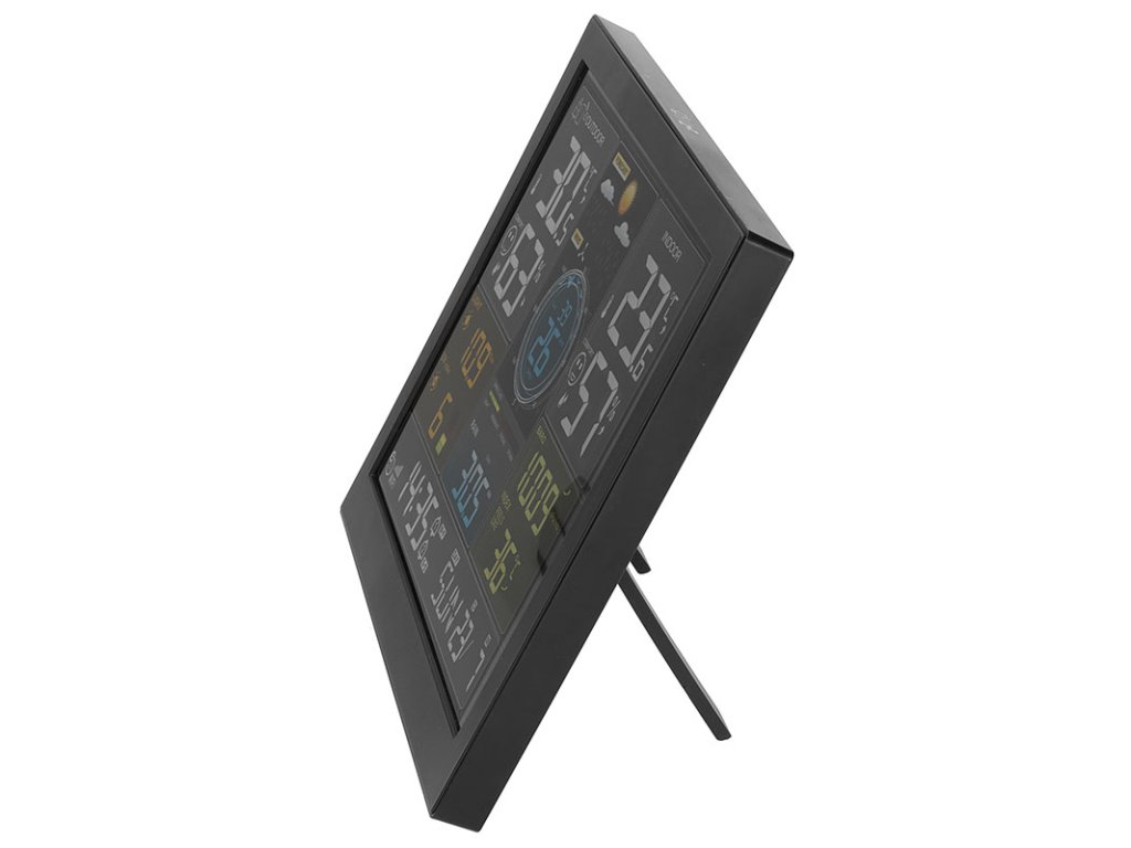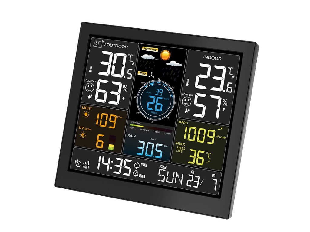 Táto profesionálna meteorologická stanica s veľkým 24,4 cm displejom ponúka pripojenie WiFi a pripojenie k aplikácii Tuya/Smart Life na zobrazenie aktuálnych údajov a štatistík. Meria vnútornú (-20 °C až 50 °C) a vonkajšiu teplotu (-40 °C až 70 °C), vlhkosť (20 % až 95 %), rýchlosť vetra (0 až 180 km/h), smer vetra (0-359°), zrážky (0 až 9999 mm), atmosférický tlak (600-1100 hPa), intenzitu svetla (0-128 klux) a UV index (0-15). Ponúka automatickú synchronizáciu času, zobrazenie dňa v týždni v 15 jazykoch, dva denné budíky s funkciou odloženia (5-60 min alebo vypnutie) a kalendár do roku 2099. Dvanásťhodinová predpoveď počasia využíva tlak vzduchu a zobrazuje ikony ako slnečno, zamračené, dážď alebo sneh. Bezdrôtové snímače s dosahom až 100 m umožňujú pripojenie 1× multikombinovaného snímača a až 3 snímačov teploty/vlhkosti. Napájanie adaptérom DC 5V/1A + 2× záložná batéria AA, snímače na batérie AAA. Vďaka možnosti pripojenia k aplikácii, širokému rozsahu meraní a presnému spracovaniu je ideálnou voľbou pre každého, kto chce mať meteorologické údaje neustále po ruke.