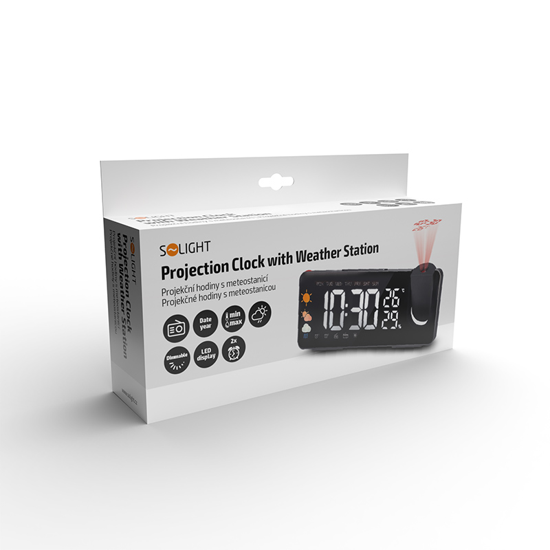 Tento moderný budík kombinuje premietanie času a teploty, FM rádio (87,5 - 108 MHz) a predpoveď počasia. Má dva budíky s nastaveniami pre budenie v pracovný deň, cez víkend alebo počas dňa a tón budíka možno nastaviť ako rádio. LED displej s nastaviteľným jasom a možnosťou otočiť projekciu o 180° na pohodlné sledovanie. Meria teplotu (-9 °C až +50 °C) a vlhkosť (20-95 %).