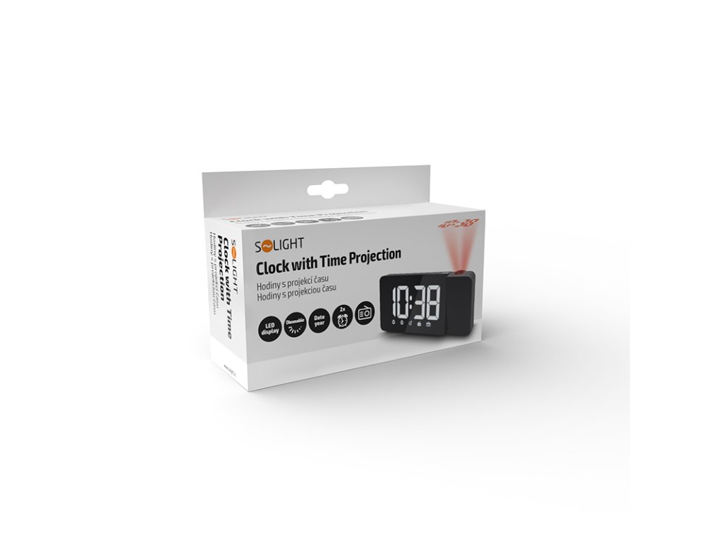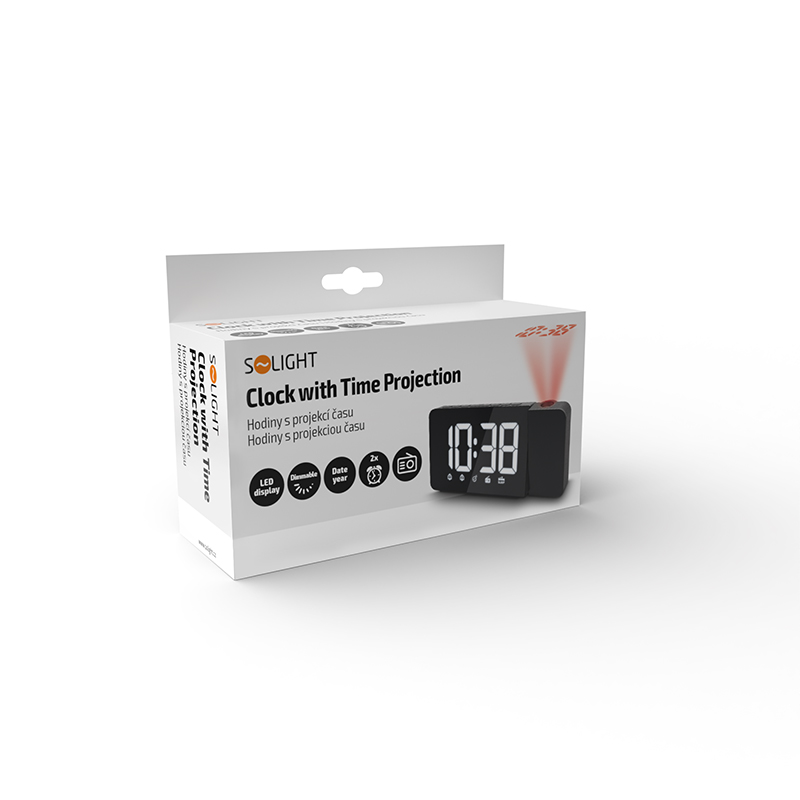 Tento nástenný budík s projekciou času je vybavený veľkým LED displejom s nastaviteľnou intenzitou podsvietenia a možnosťou otáčania projektora v rozsahu 0-180°. Umožňuje budenie rádiom alebo budíkom, má rádio FM s automatickým ladením staníc a funkciu odloženia budenia (0-60 min). Vďaka trom úrovniam premietania (vysoká, nízka, vypnutá) si môžete nastaviť zobrazenie podľa svojich potrieb. Napájanie DC5V (adaptér je súčasťou dodávky) a záložná batéria CR2032 na uchovanie nastavení.