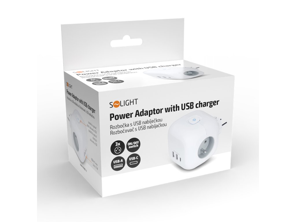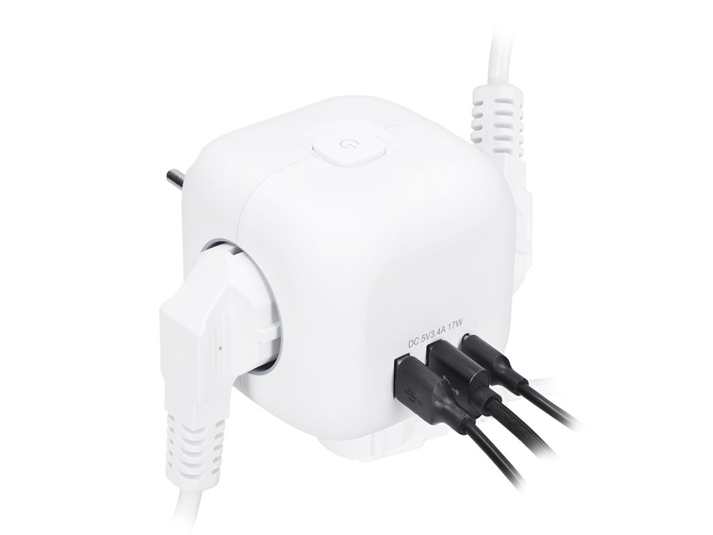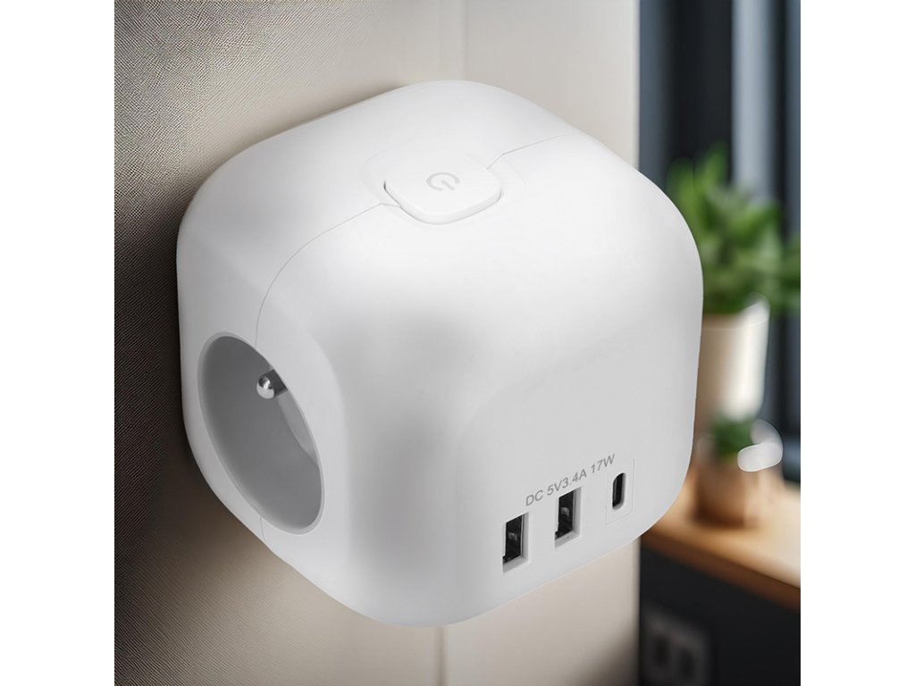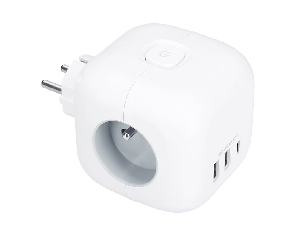 Rozbočka v tvare kocky s dĺžkou strany 8 cm spája tri uzemnené zásuvky s detskou poistkou a USB nabíjačku s portami USB-C a USB-A. Vďaka kompaktnému prevedeniu je ideálny na použitie v akomkoľvek interiéri. Podsvietený vypínač umožňuje jednoduché ovládanie všetkých zásuviek aj USB portov.