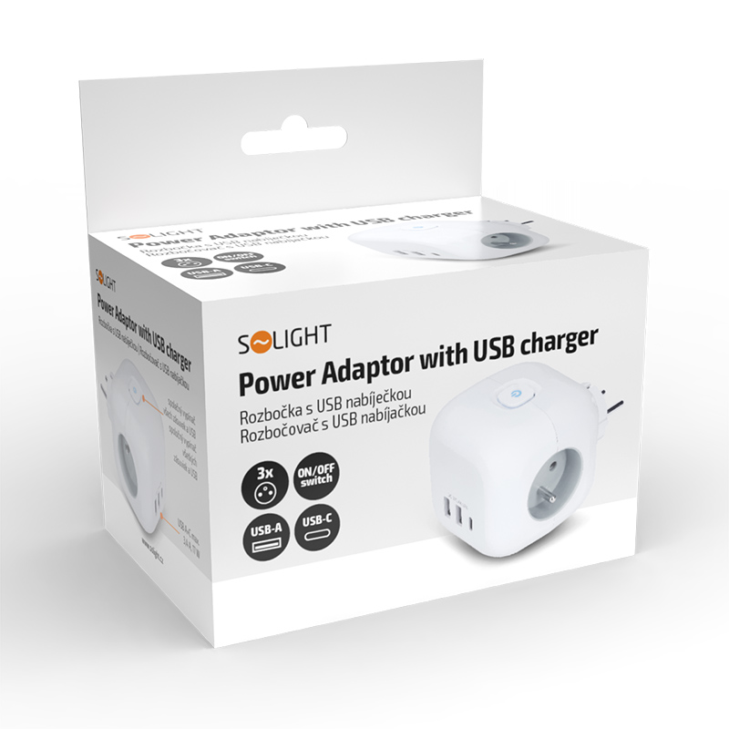 Solight rozbočka kocka, 3x 16A + USB A+C, biela, vypínač