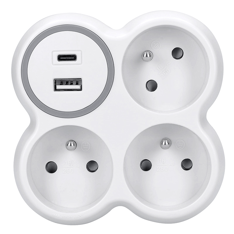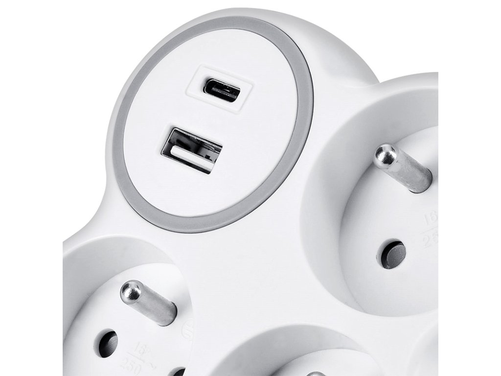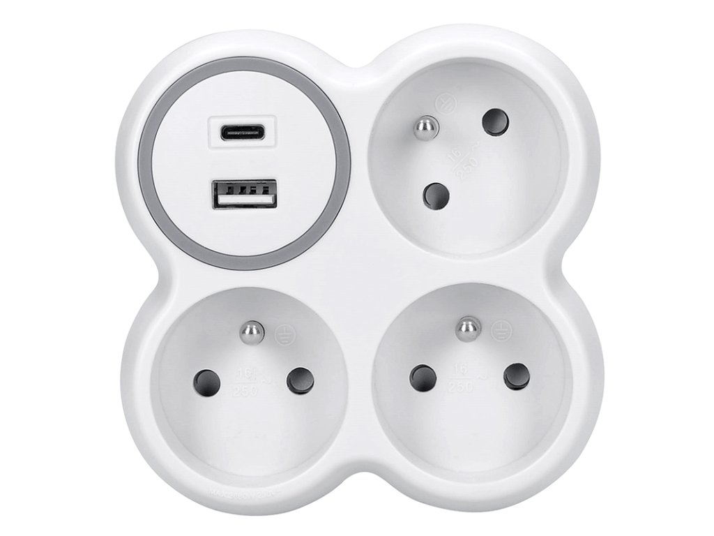 Solight rozbočovač, 3x 15A, USB nabíjačka A+C, biely-sivý