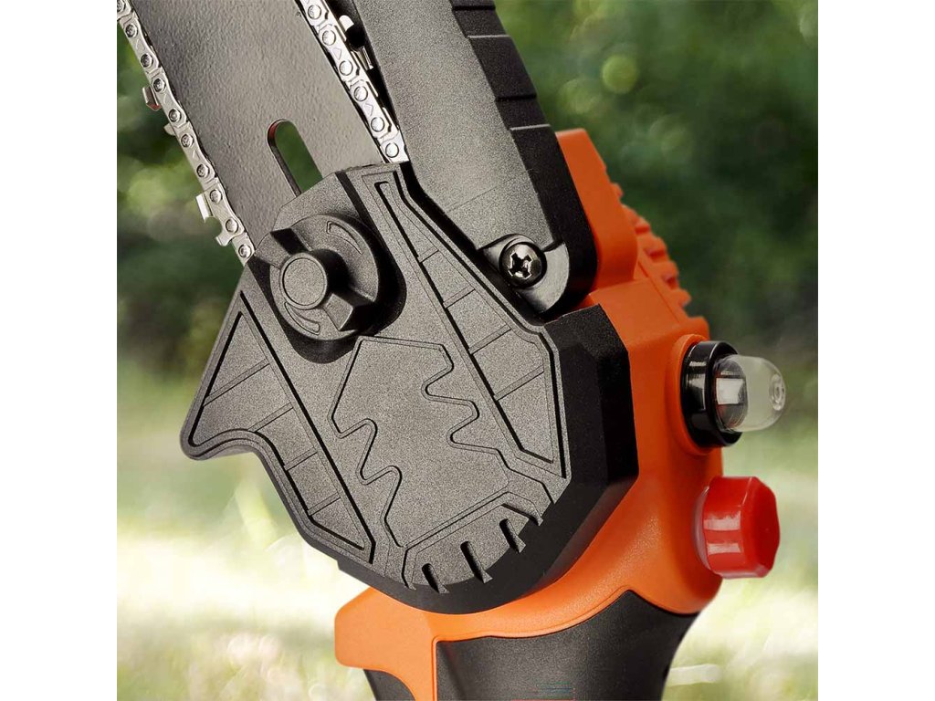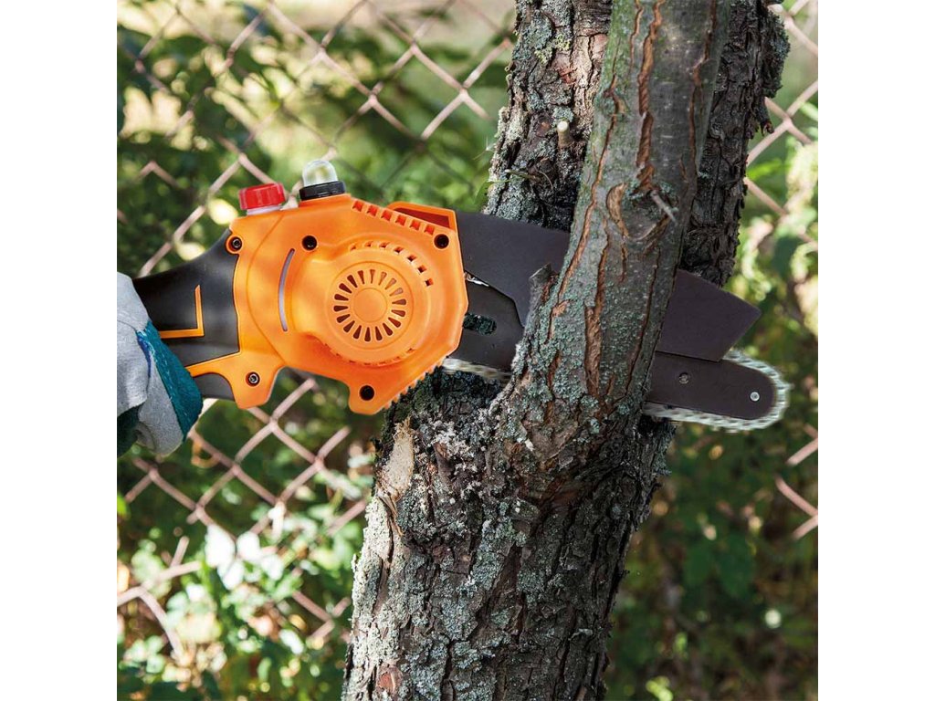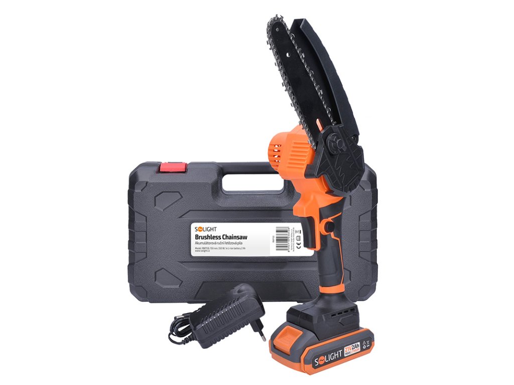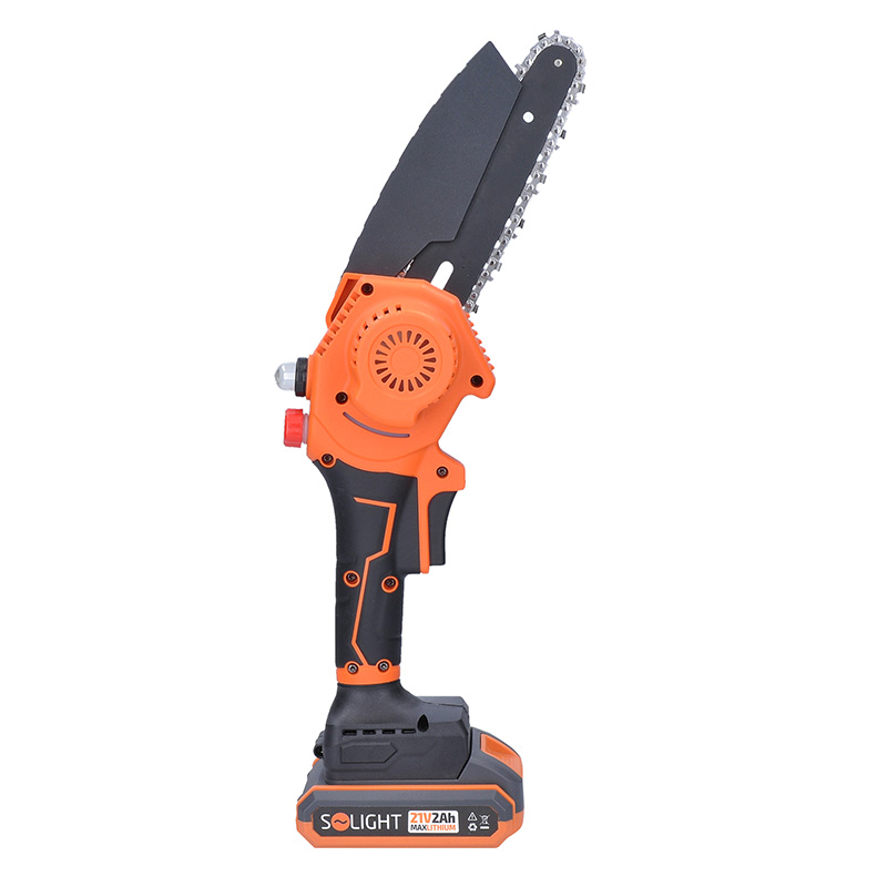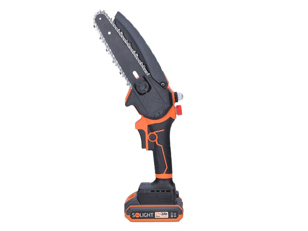 Ručná akumulátorová reťazová píla s bezuhlíkovým motorom a ručným olejovým čerpadlom na jednoduché mazanie reťaze. Vďaka hliníkovej lište, nízkej hmotnosti (1,1 kg) a jednoduchej obsluhe a údržbe je táto píla ideálna na prerezávanie stromov a kríkov. Dĺžka lišty 100 mm, rýchlosť rezania 5 m/s. Súčasťou balenia je: plastový kufor, 1x 2Ah batéria, nabíjačka, skrutkovač, uťahovací kľúč a návod. Bezpečnostná poistka proti náhodnému spusteniu a zábrana proti dotyku reťaze pre bezpečnosť. Napájanie Li-Ion akumulátor 21 V 2Ah, čas nabíjania cca 150 min. Rozmery s batériou: 36 x 12 x 10,5 cm.