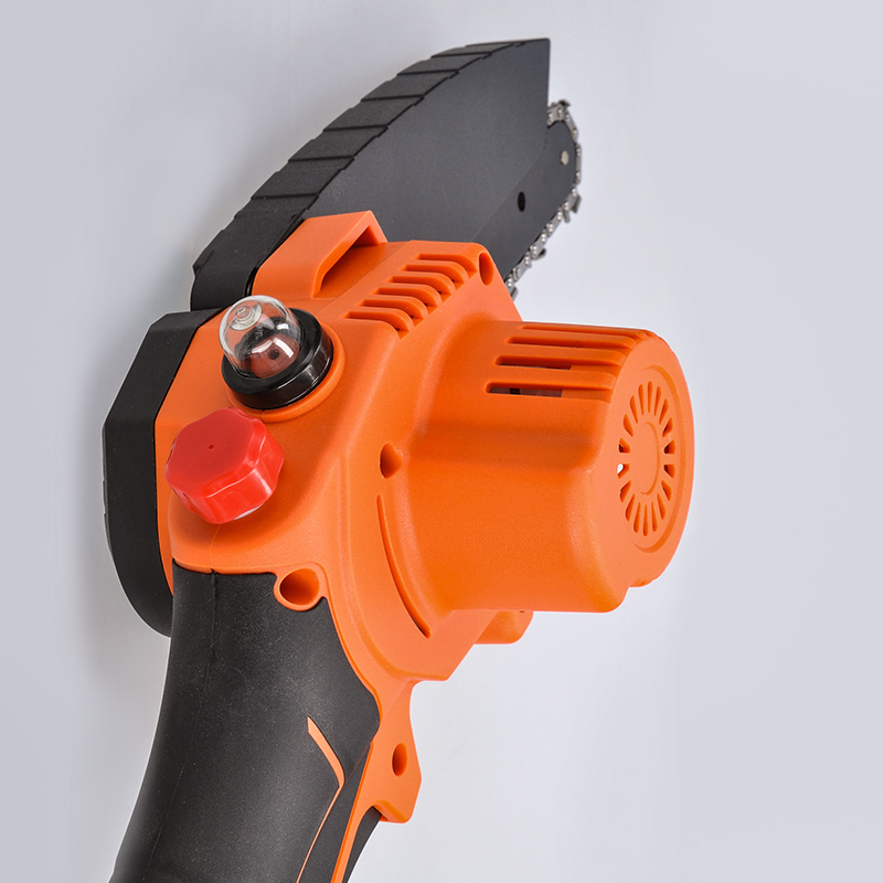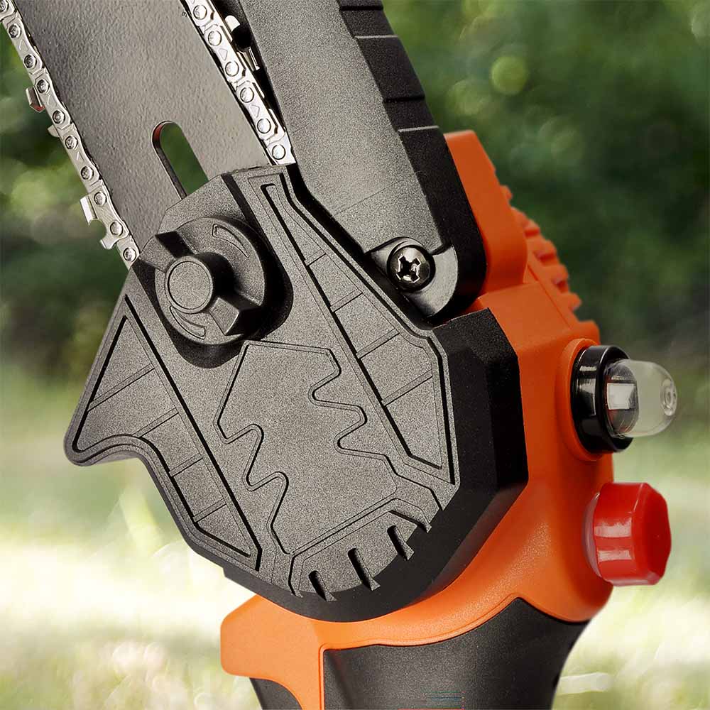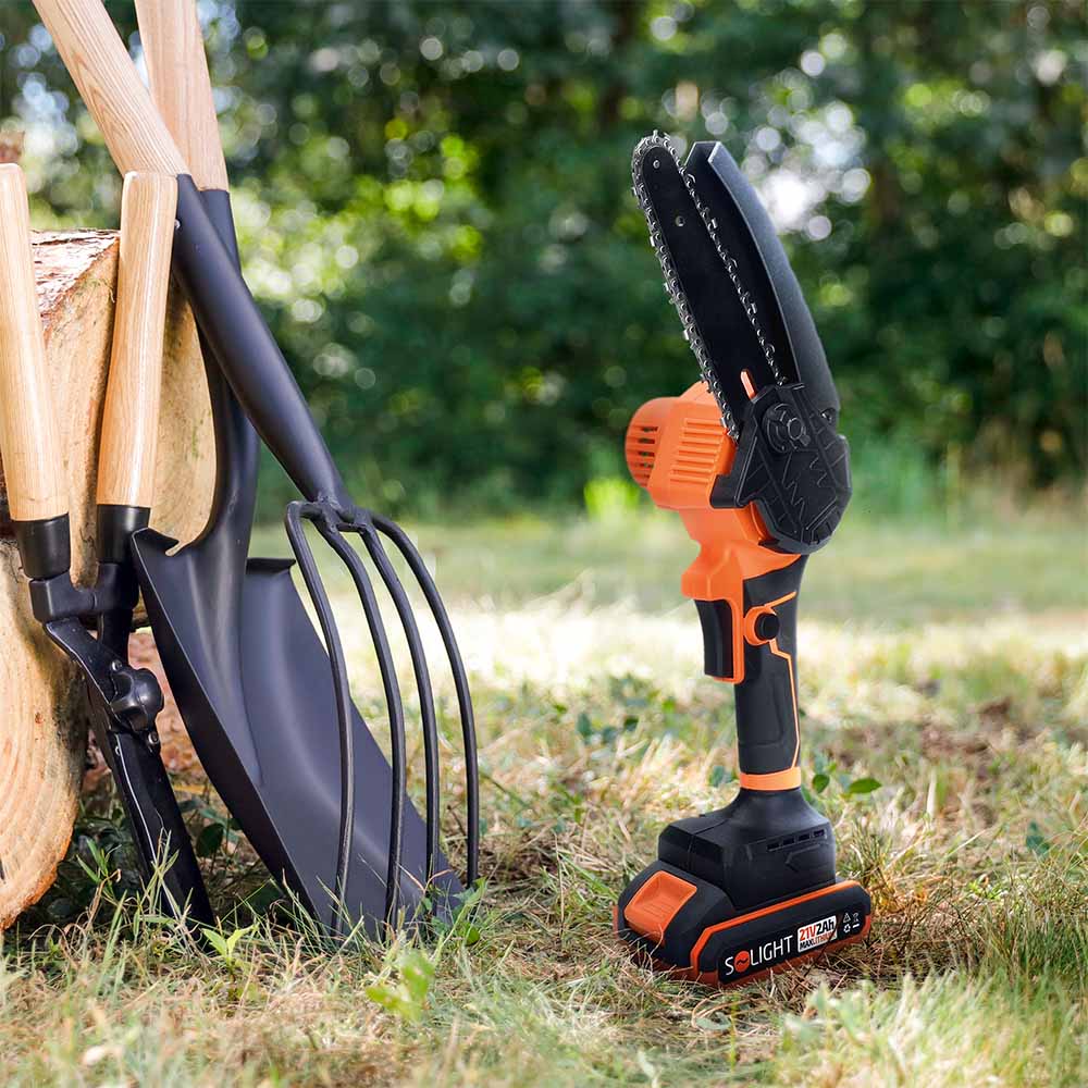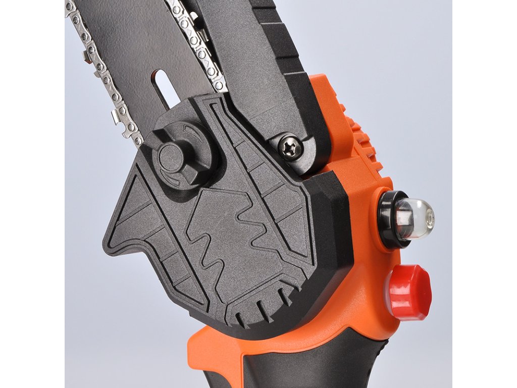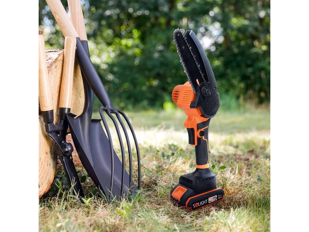 Ručná akumulátorová reťazová píla s bezuhlíkovým motorom a ručným olejovým čerpadlom na jednoduché mazanie reťaze. Vďaka hliníkovej lište, nízkej hmotnosti (1,1 kg) a jednoduchej obsluhe a údržbe je táto píla ideálna na prerezávanie stromov a kríkov. Dĺžka lišty 100 mm, rýchlosť rezania 5 m/s. Súčasťou balenia je: plastový kufor, 1x 2Ah batéria, nabíjačka, skrutkovač, uťahovací kľúč a návod. Bezpečnostná poistka proti náhodnému spusteniu a zábrana proti dotyku reťaze pre bezpečnosť. Napájanie Li-Ion akumulátor 21 V 2Ah, čas nabíjania cca 150 min. Rozmery s batériou: 36 x 12 x 10,5 cm.