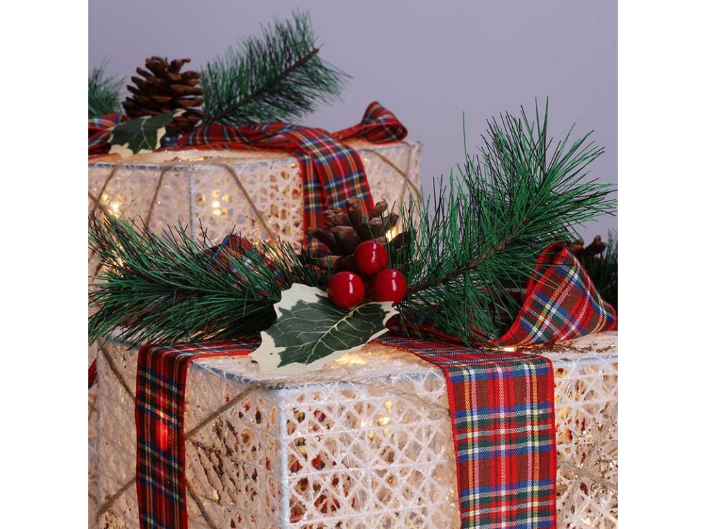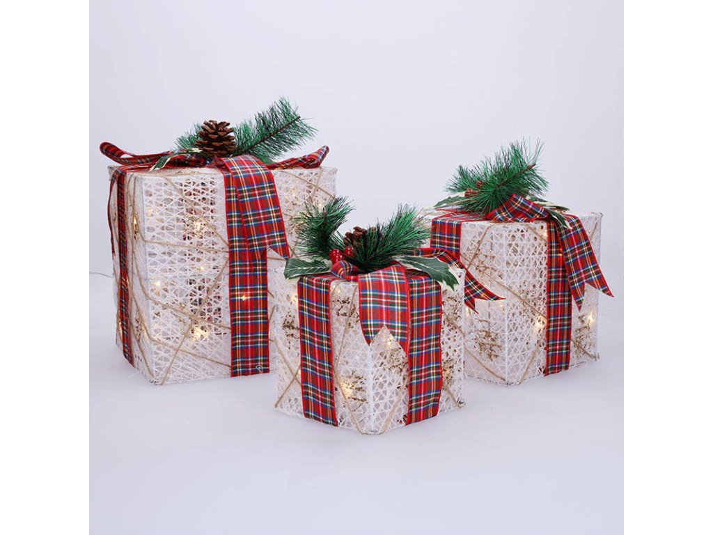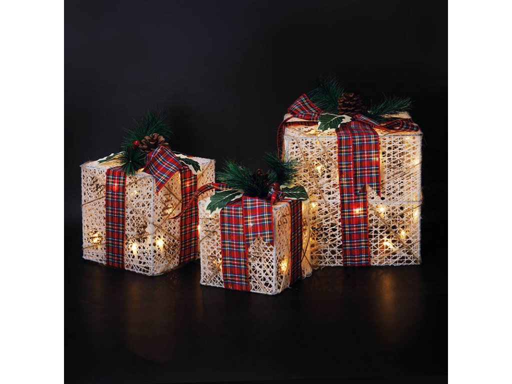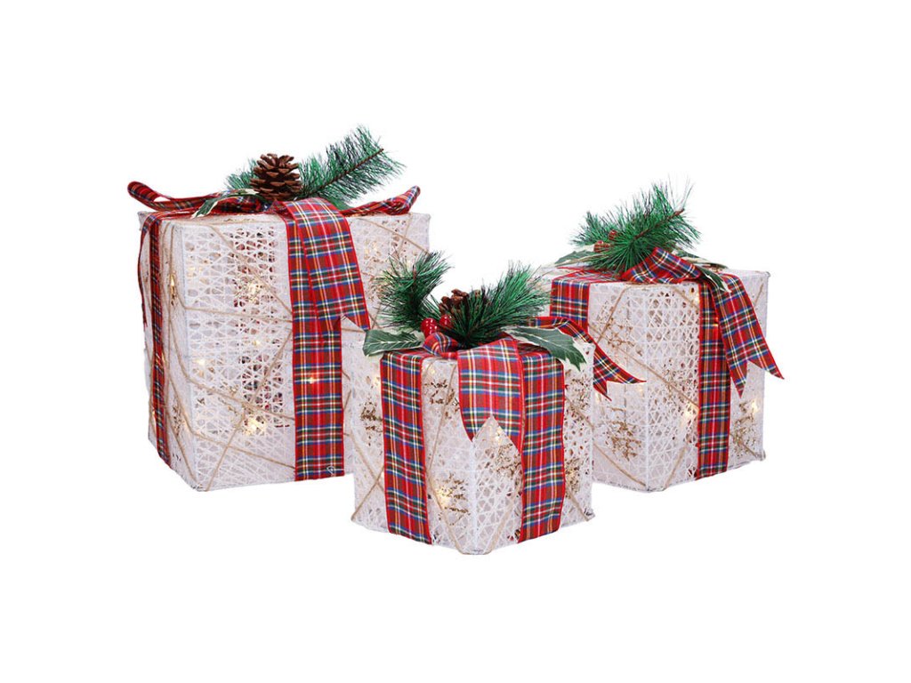 Sada obsahuje tri darčeky rôznych veľkostí (20 cm, 15 cm a 12 cm), ktoré sú osvetlené 48 LED diódami v teplej bielej farbe. Vďaka praktickému časovaču sa svetlá automaticky zapnú na 6 hodín a potom sa na 18 hodín vypnú, čo zaisťuje pohodlné a energeticky úsporné používanie.