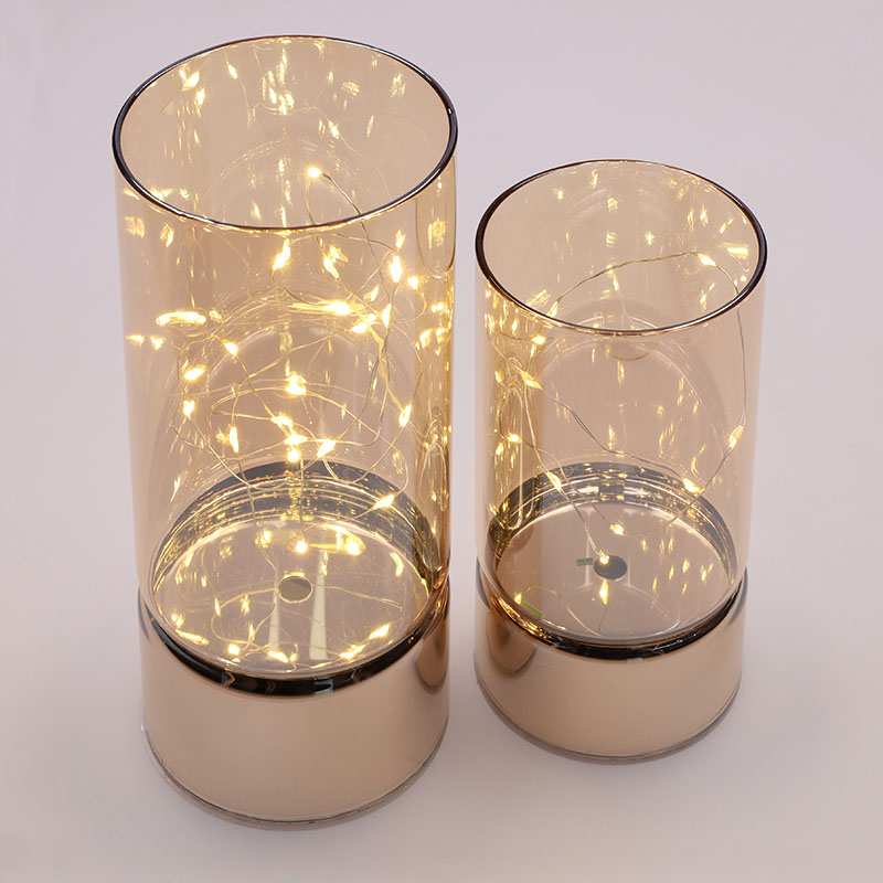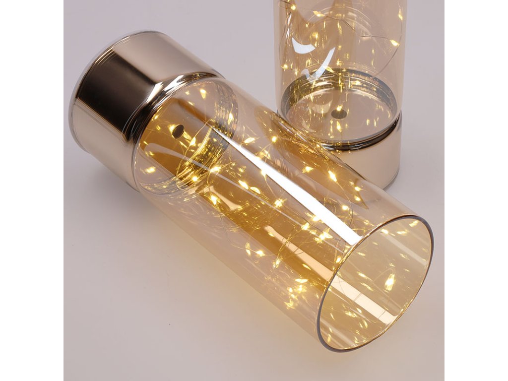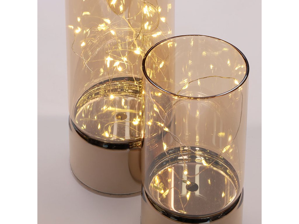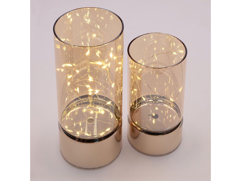 Sada obsahuje dve sklenené svetielka rôznych veľkostí, vybavené LED diódami – menšou s 10 diódami a väčšou s 20 diódami. Jemné svetlo krásne presvitá zlatým skleneným povrchom a vytvára pôsobivý efekt. Vďaka praktickému časovaču sa svetielka automaticky zapnú na 6 hodín a potom sa na 18 hodín vypnú, čo zaisťuje pohodlné a úsporné používanie.