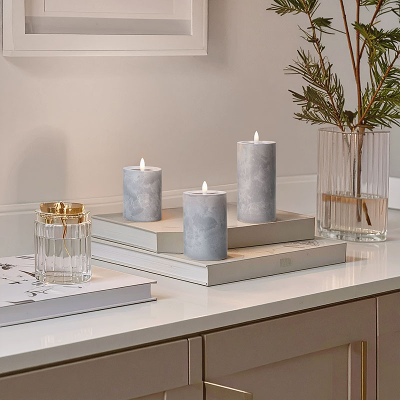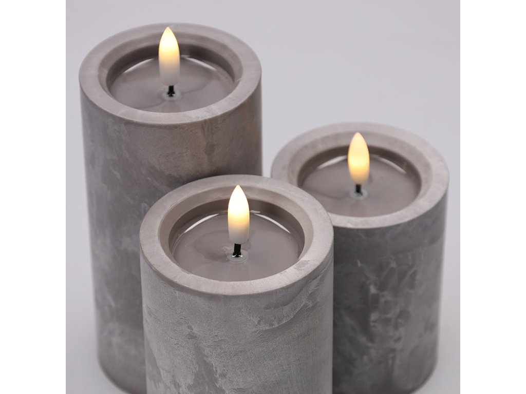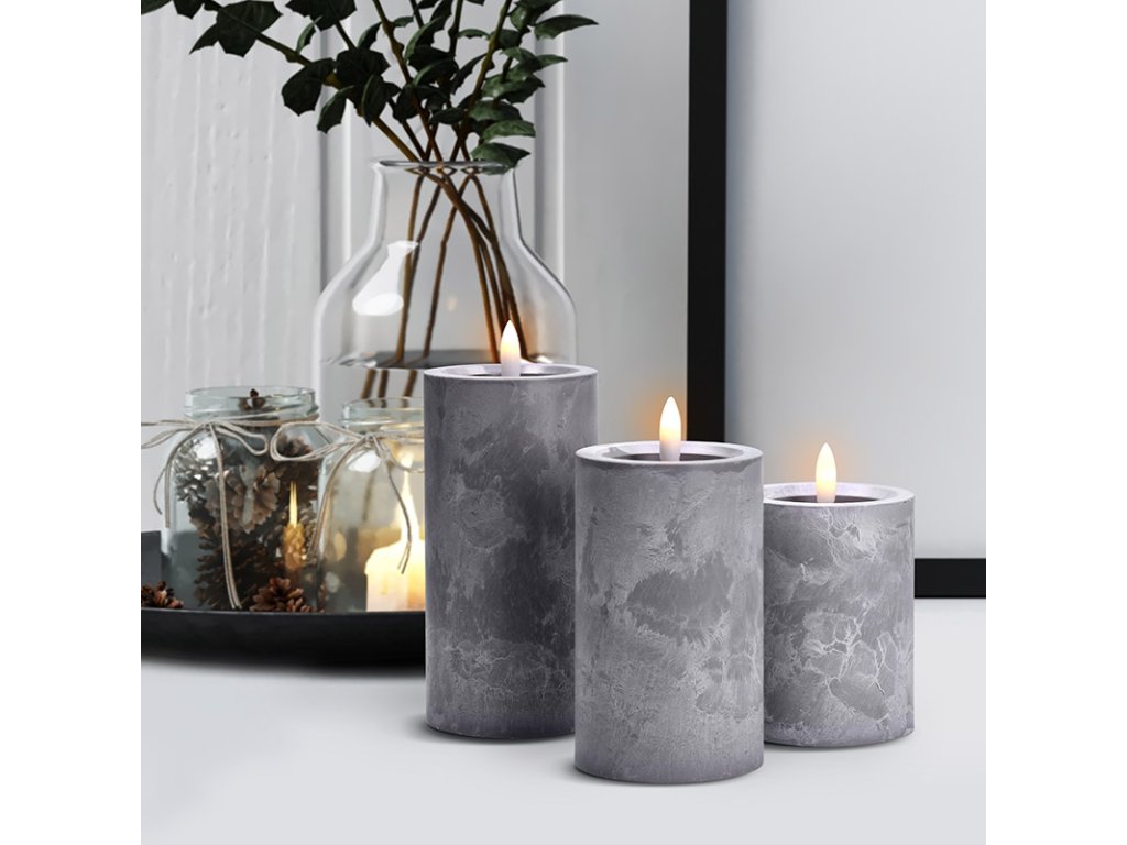 Vytvorte si elegantnú atmosféru s LED sviečkami s efektom prirodzene blikajúceho plameňa a luxusným dekorom šedého mramoru. Táto sada troch sviečok vnesie do vášho interiéru moderný a útulný vzhľad bez nebezpečenstva otvoreného ohňa.