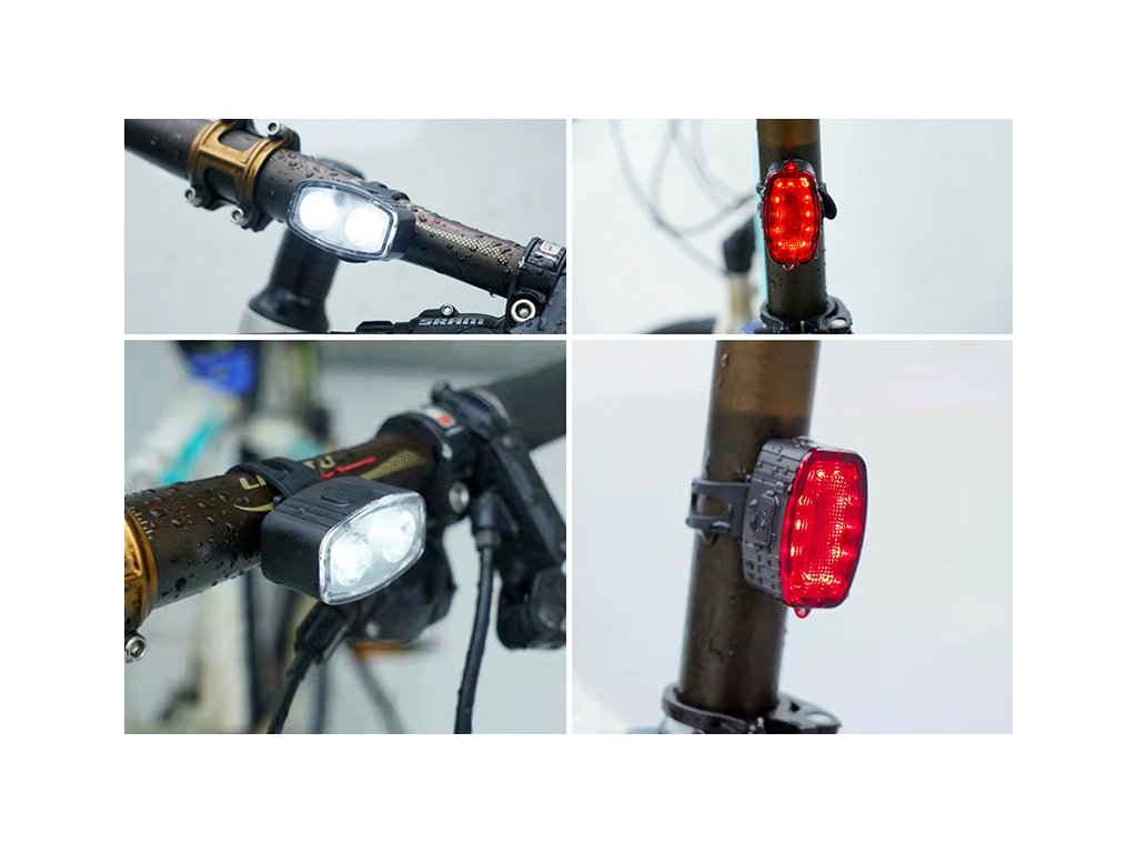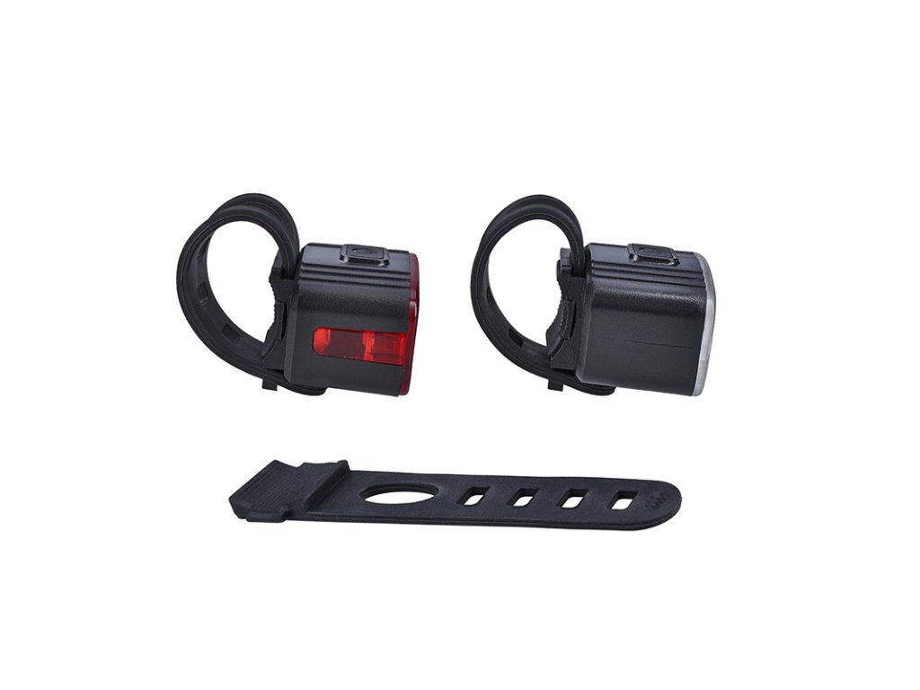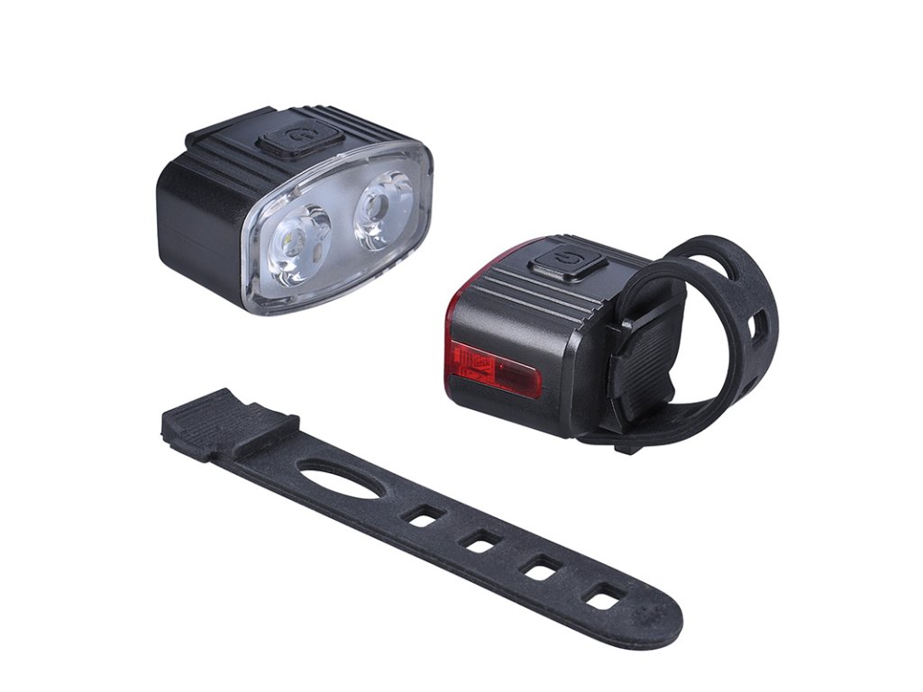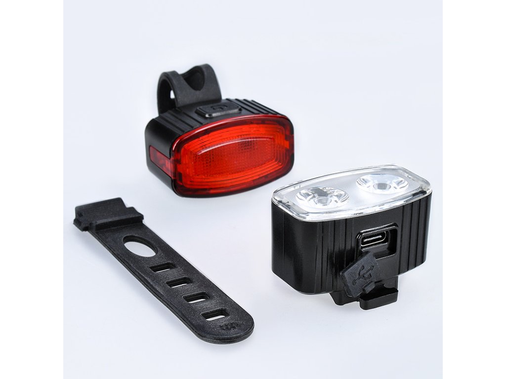 Súprava dobíjacích LED svetiel na bicykel ponúka kompletné riešenie pre bezpečnú jazdu. Predné svetlo s jasom 160 lm ponúka tri režimy - 100 %, 60 % a 30 %. Zadné červené svetlo má šesť režimov vrátane rôznych možností blikania. Súprava je odolná voči vlhkosti (IP44) a obsahuje dve 350 mAh Li-Ion batérie s výdržou 1,5 až 4 hodiny. Nabíjanie trvá približne 4 hodiny prostredníctvom kábla USB (je súčasťou dodávky). Svietidlá sa dajú ľahko upevniť pomocou pružných gumičiek. Kompaktné rozmery (45 x 25 x 30 mm) a elegantný čierny dizajn zaručujú nenápadný, ale efektívny doplnok každého bicykla.