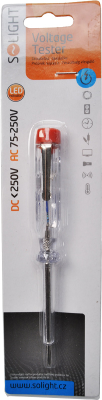 Tester napätia pre striedavý prúd 70-250 V a jednosmerný prúd <250 V. Optická signalizácia na určenie fázy a kontrolu elektrických spotrebičov. Rozmery: 3 mm x 140 mm.