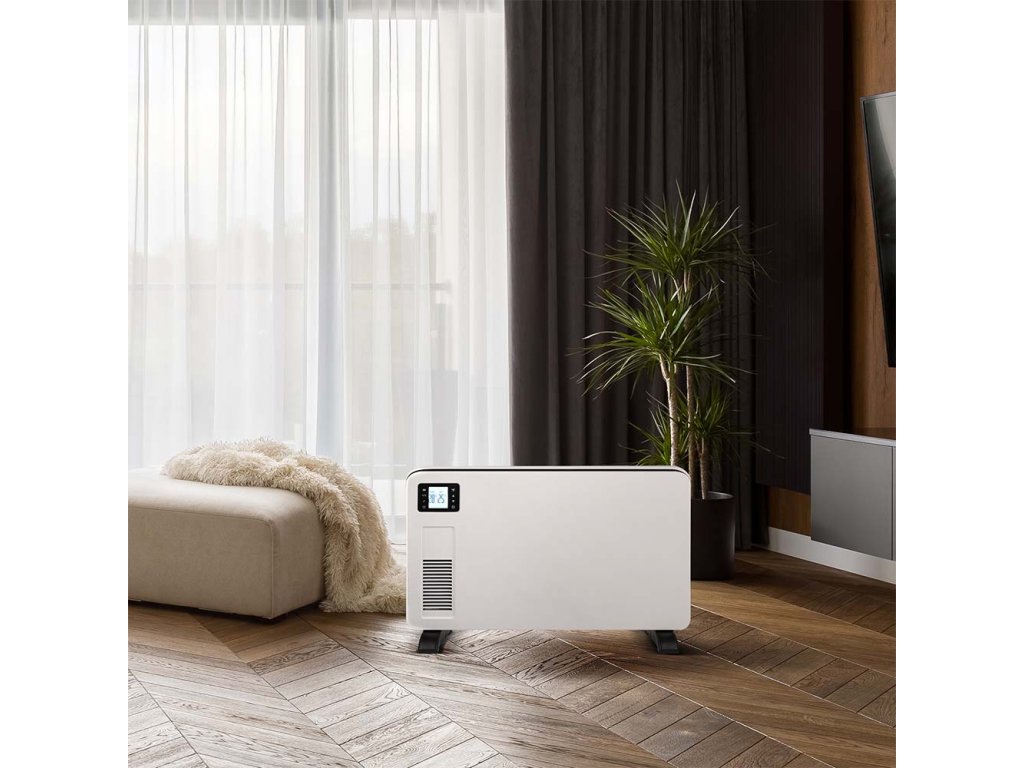 Výkonný 2300W priamy ohrievač s prepínaním výkonu (1000/1300/2300 W) a ventilátorom na rýchlejšie vyhriatie miestnosti. Má LCD displej, nastaviteľný termostat a týždenný časovač. Diaľkové ovládanie na pohodlné nastavenie. Stabilné nožičky na bezpečné umiestnenie a ochrana proti prehriatiu zabezpečujú bezpečnú prevádzku. Ideálny na efektívne vykurovanie domácnosti.