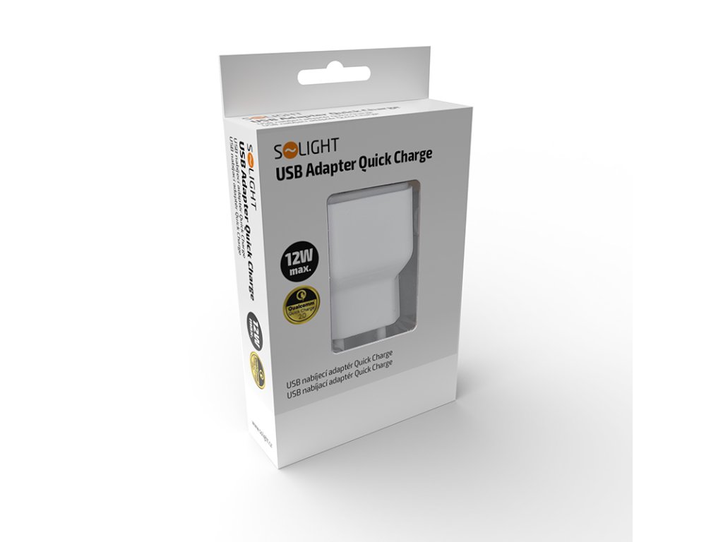 Solight USB nabíjací adaptér, fast charge: 1x USB Qualcomm, 5V2A/9V1.5A/12V1A, AC 230V, bielosivý