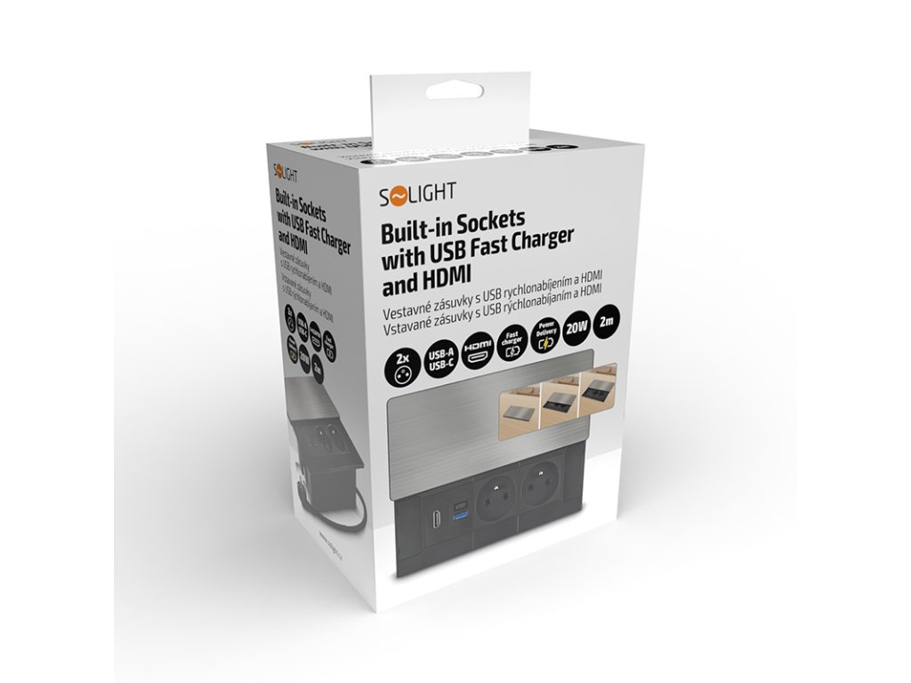 Solight vestavný blok zásuviek s posuvným krytom, 2 zásuvky, HDMI, USB A+C 20W PD, 2m, strieborný