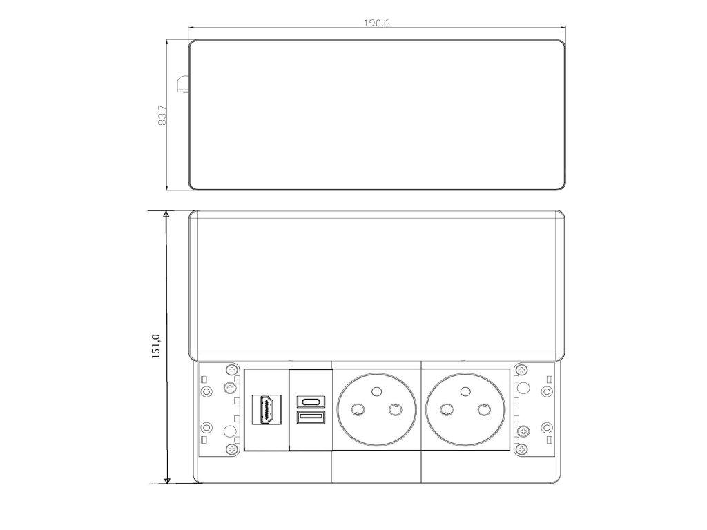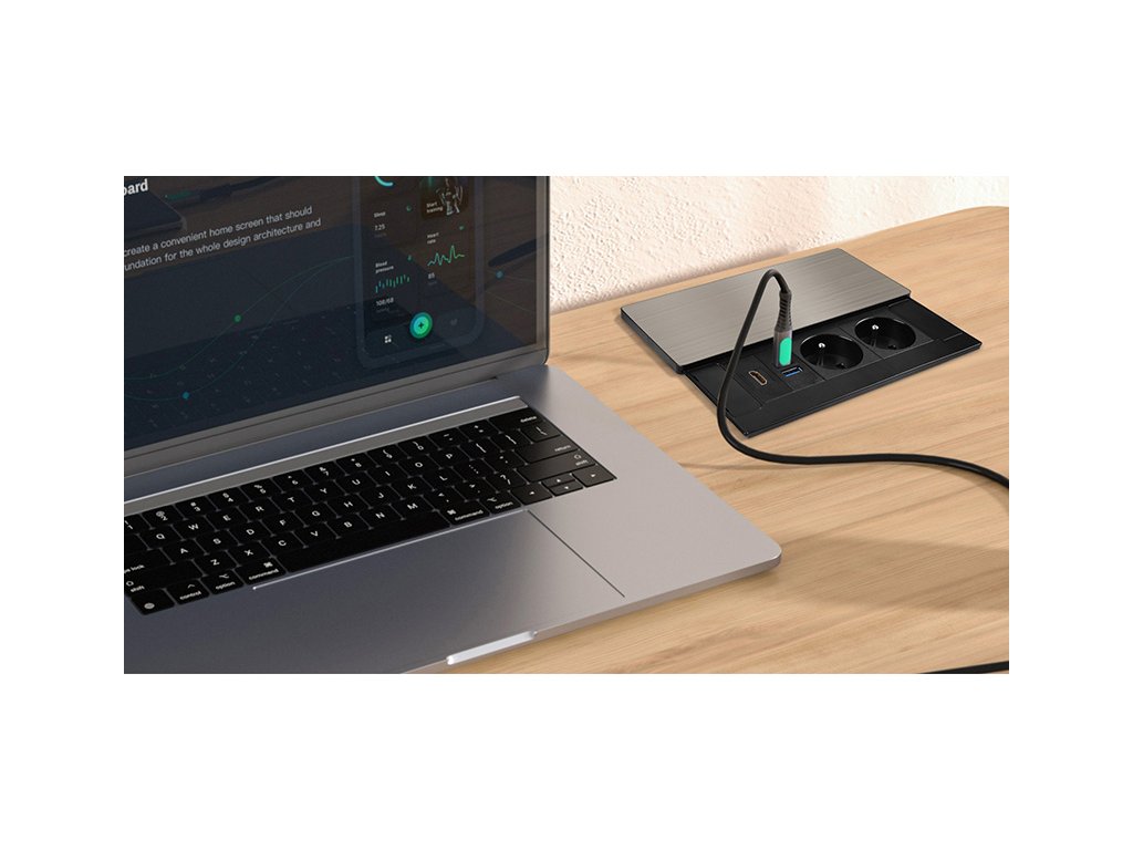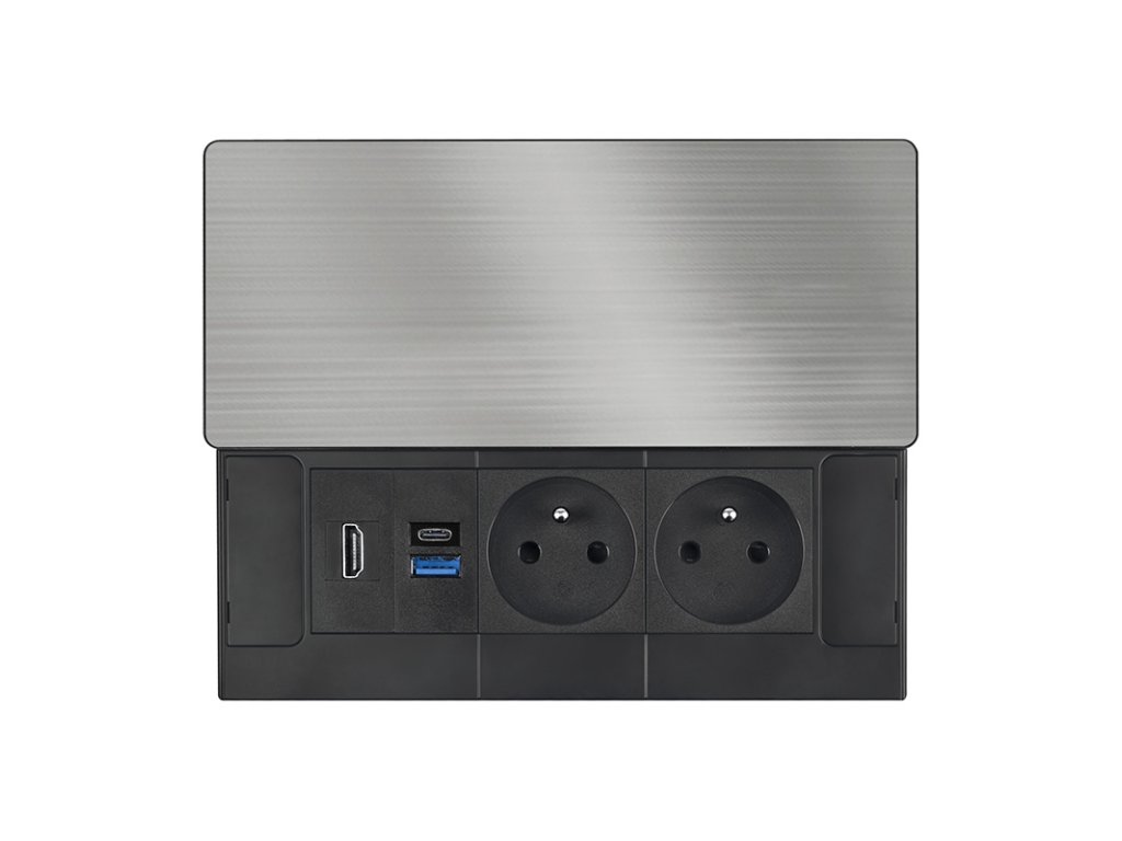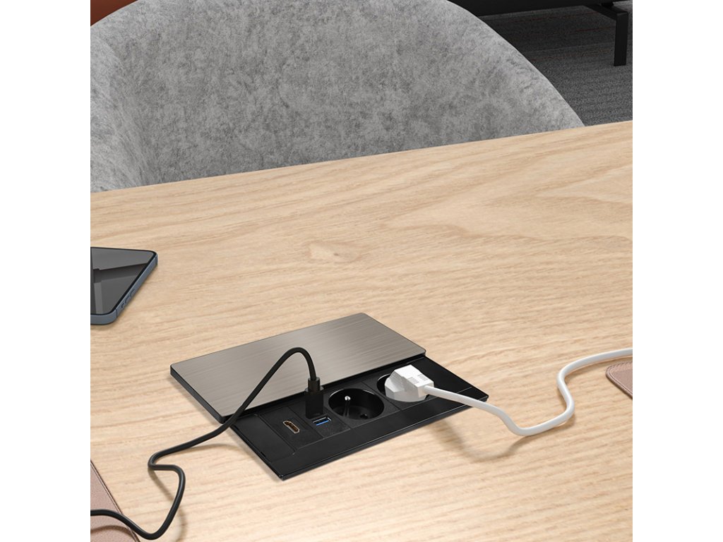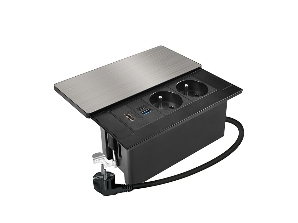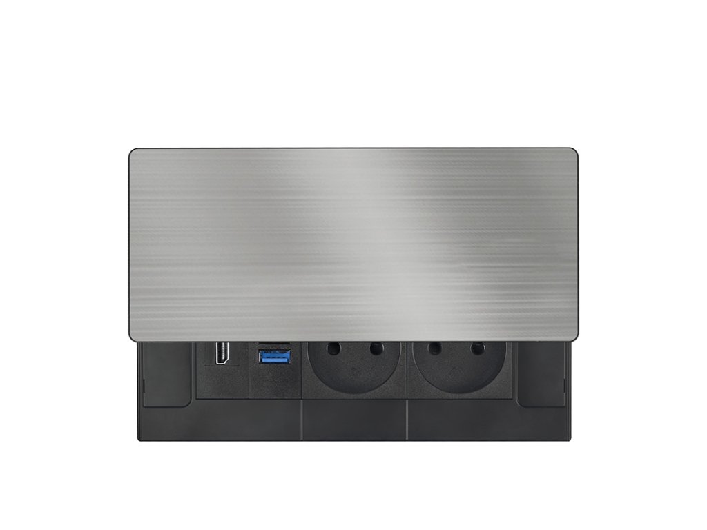 Tento vstavaný blok zásuviek ponúka viac ako len napájanie - kombinuje dve sieťové zásuvky 230 V, USB rýchlonabíjačku a HDMI port v jednom kompaktnom module. Vrchný kryt z matnej tmavej nerez ocele (inox) s posuvným mechanizmom sa ľahko začlení do moderného interiéru pracovných stolov, prezentačných priestorov aj obývacích izieb. Vďaka káblu s dĺžkou 2 metre je inštalácia flexibilná a pohodlná.
