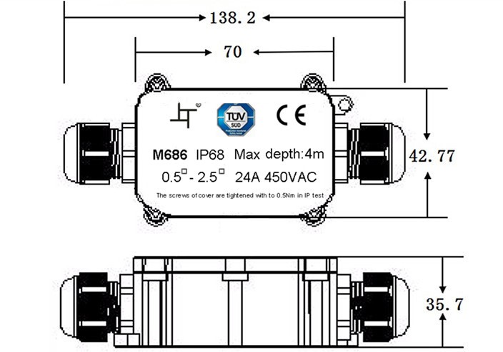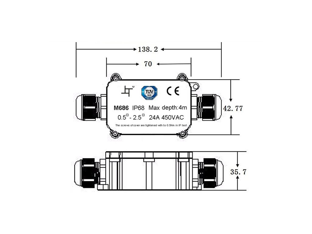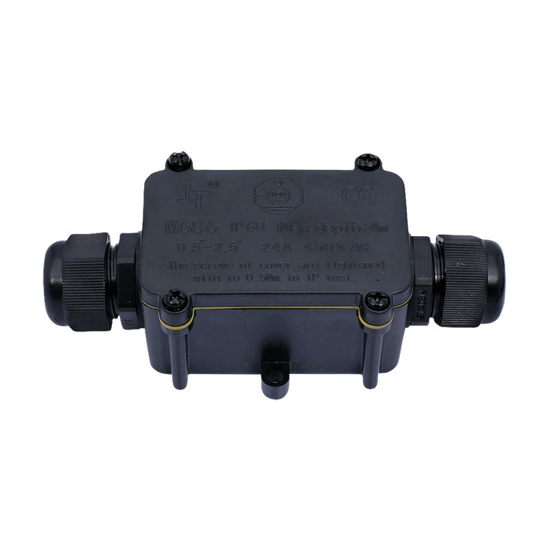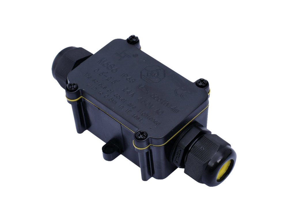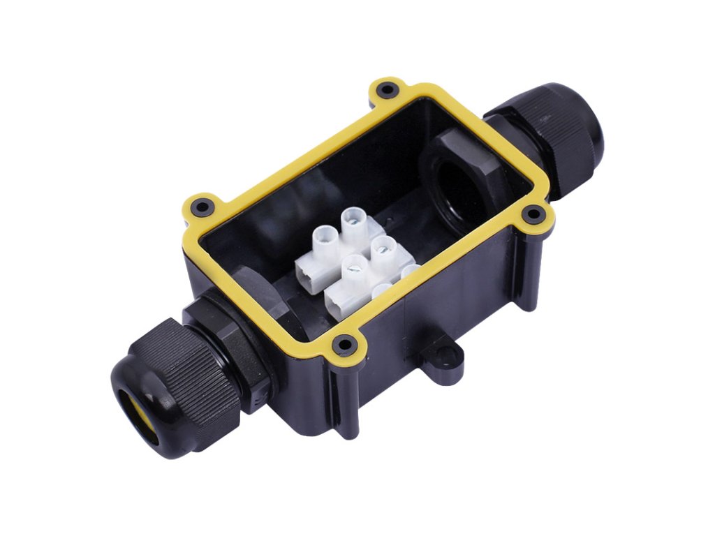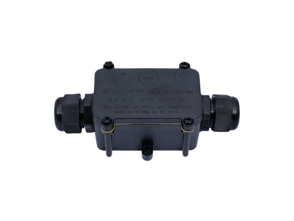 Vodotesná rozvodná skrinka s jedným vstupom a jedným výstupom ponúka pohodlné a bezpečné pripojenie dvoj- alebo trojvodičových káblov. Vďaka krytiu IP68 a odolnej konštrukcii vydrží používanie aj v extrémnych podmienkach s možnosťou krátkodobého ponorenia do vody (max. 3 m, 48 h).