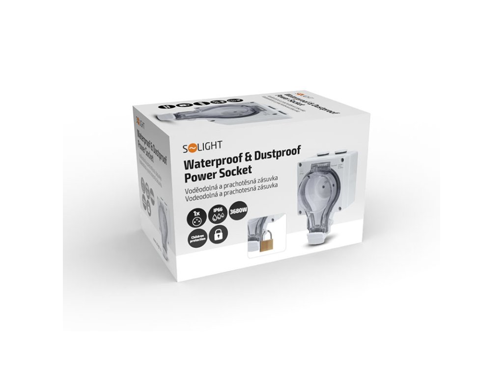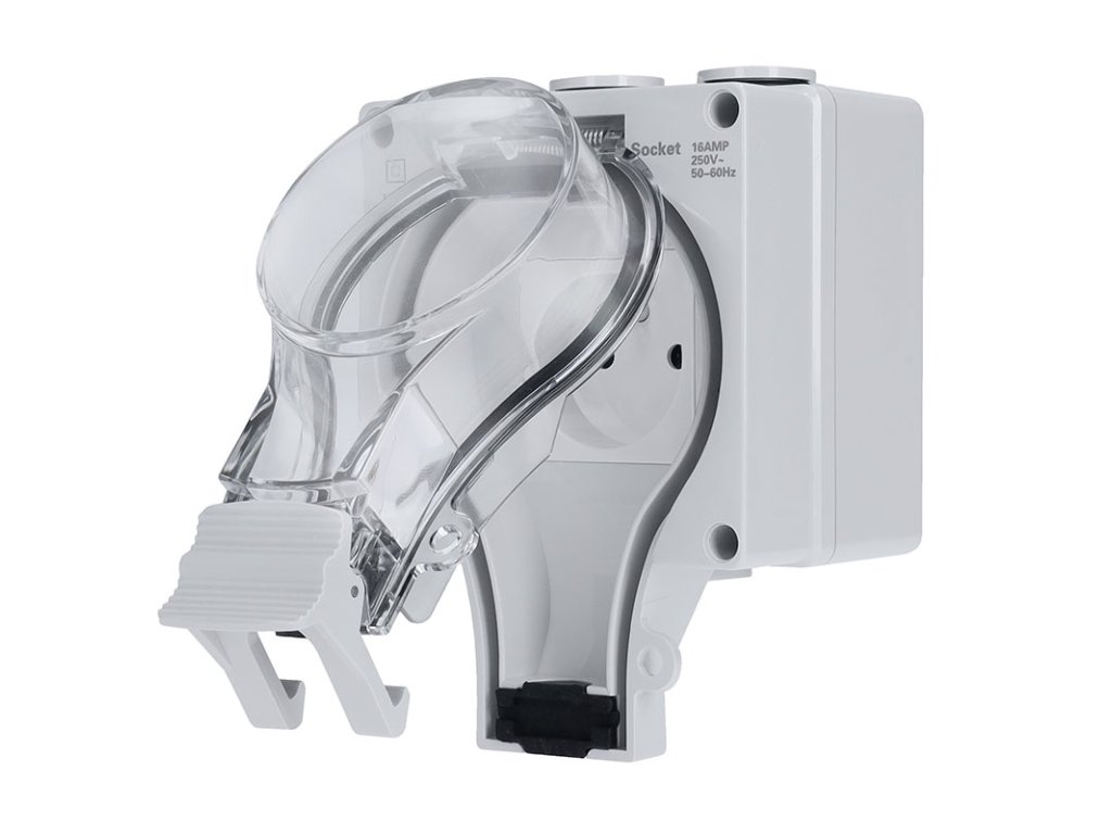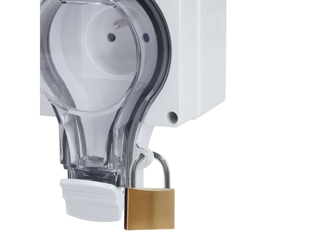 Priehľadné veko zásuvky je možné uzamknúť visiacim zámkom, čo chráni proti nechcenej manipulácii a zvyšuje bezpečnosť. Predĺžený kryt chráni časť kábla a zároveň slúži aj ako páka na ľahšie uzavretie veka. Gumové tesnenie a zátky zaisťujú dokonalé utesnenie proti vode a prachu. Odolnosť proti horúčave 850 ° C umožňuje inštalovať aj na horľavé materiály. Konštrukcia je navrhnutá tak, aby odolala intenzívnym klimatickým podmienkam, čím zaisťuje dlhodobú spoľahlivosť a bezpečnosť pri používaní.
