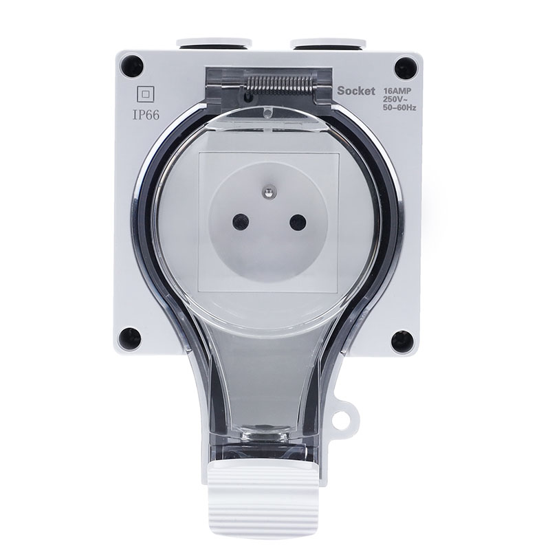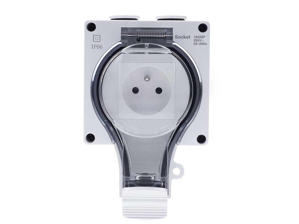 Vonkajšia zásuvka s priehľadným vekom a krytím IP66 ponúka maximálnu bezpečnosť v náročných podmienkach. Je plne chránená proti prachu, tryskajúcej vode zo všetkých smerov a úrazom elektrickým šokom pri kontakte s nástrojmi či drôtmi väčšími ako 1 mm. Vďaka tomuto vysokému stupňu ochrany je ideálny na použitie v priemyselnom aj domácom prostredí, a to aj vo vlhkých alebo prašných podmienkach.