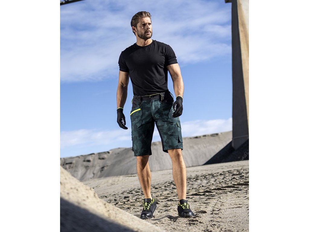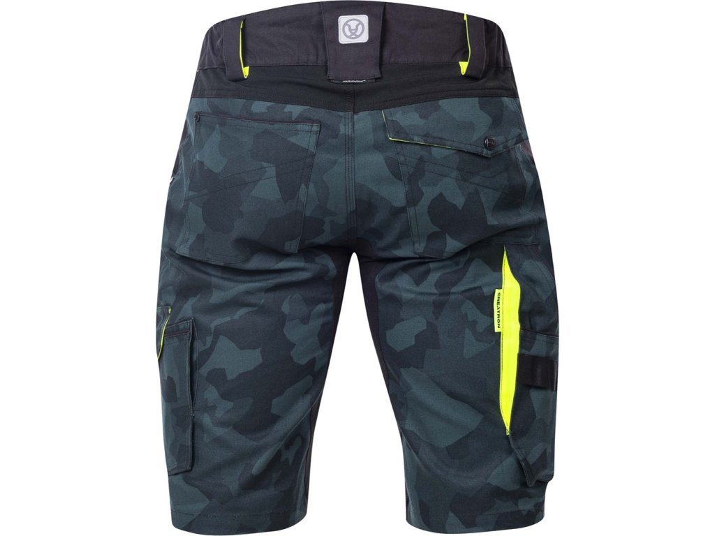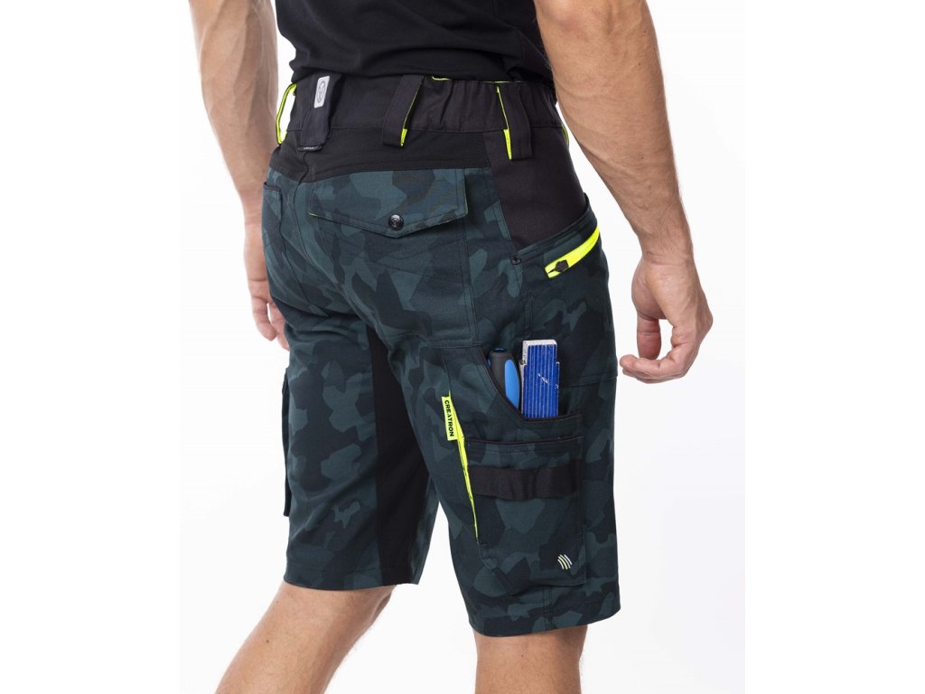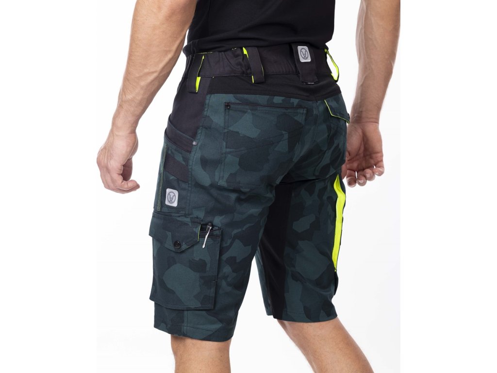 Strečové bavlnené šortky zo špeciálneho materiálu Amalytton®, ktorý sa vyznačuje zvýšenou pevnosťou a hladkým, jemným povrchom. Optimálnu gramáž ceníte vďaka príjemnému pocitu pri nosení. Na exponovaných miestach je použitý odolný a štvorsmerne elastický materiál Tabiflex®. Šortky majú elastický golier v páse spolu so skrytým zadným dvojitým pútkom na opasok pre pohodlné uchytenie pásu, vnútornú protišmykovú pásku, zapínanie na D-krúžok, 2 klinové vrecká, 1 predné vrecko na zips, 1 predné náprsné vrecko so širokým pútkom, na pravej nohavici je multifunkčné vrecko na skladací meter, skrutkovač a páčidlo so širokými pútkami, na ľavej nohavici je veľké dvojité vrecko kryté chlopňou na gombík, trojité prešitie v namáhaných oblastiach. Zadný diel je rozdelený sedlom, 2 vrecká, pravé zadné vrecko je prekryté chlopňou na gombík. Dynamické reflexné 3D potlače a hi-vis doplnky zabezpečujú zvýšenú viditeľnosť používateľa.
