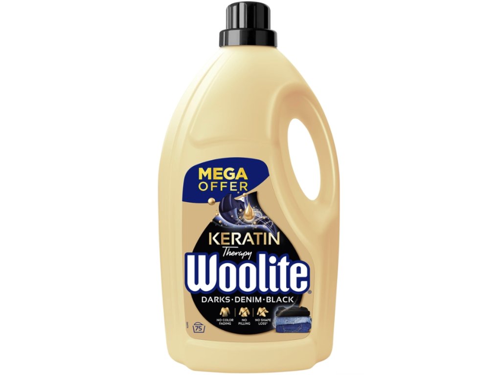Woolite Keratin Therapy Darks Denim Black je vysoce účinný tekutý prací gel na denim, černé a tmavé prádlo, který nejenom účinně čistí, ale také chrání barvy na oblečení před vyblednutím. Díky obsahu keratinu pomáhá chránit textilní vlákna, dodává jim jemnost, chrání před žmolkováním a látku nemačká.